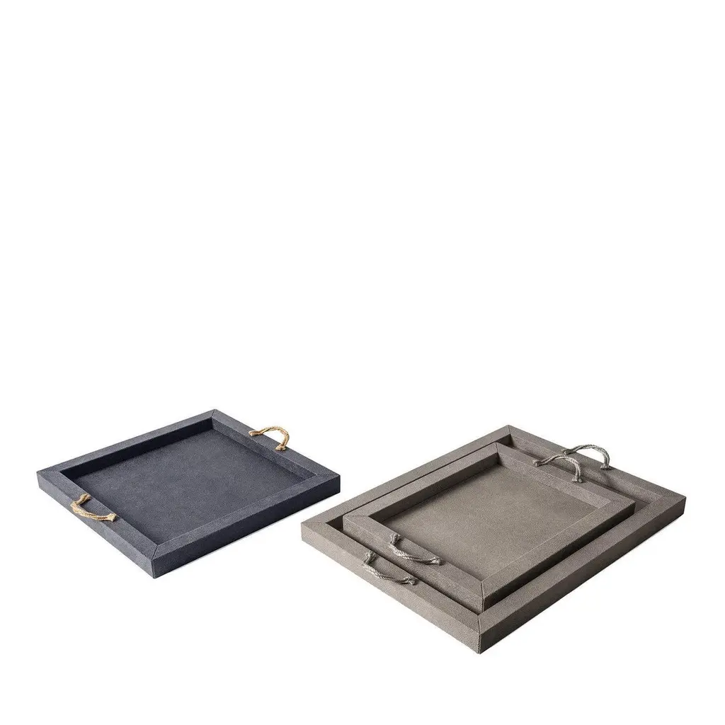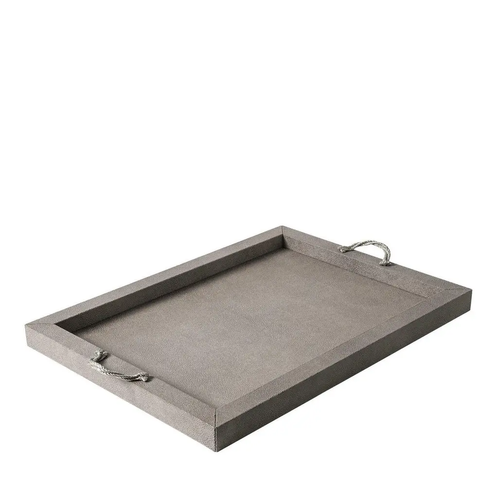 Part of the Thalia Collection, this tray is a celebration of minimalism and sophistication. Crafted of wood with an anti-slip base, its rectangular silhouette is covered in leather with an elegant grey color that complements the chrome finish on the two handles made of metal in the shape of curved passementerie. Either alone or combined with other pieces in the same series, this tray can be used to permanently display collectibles or serve food and drinks.