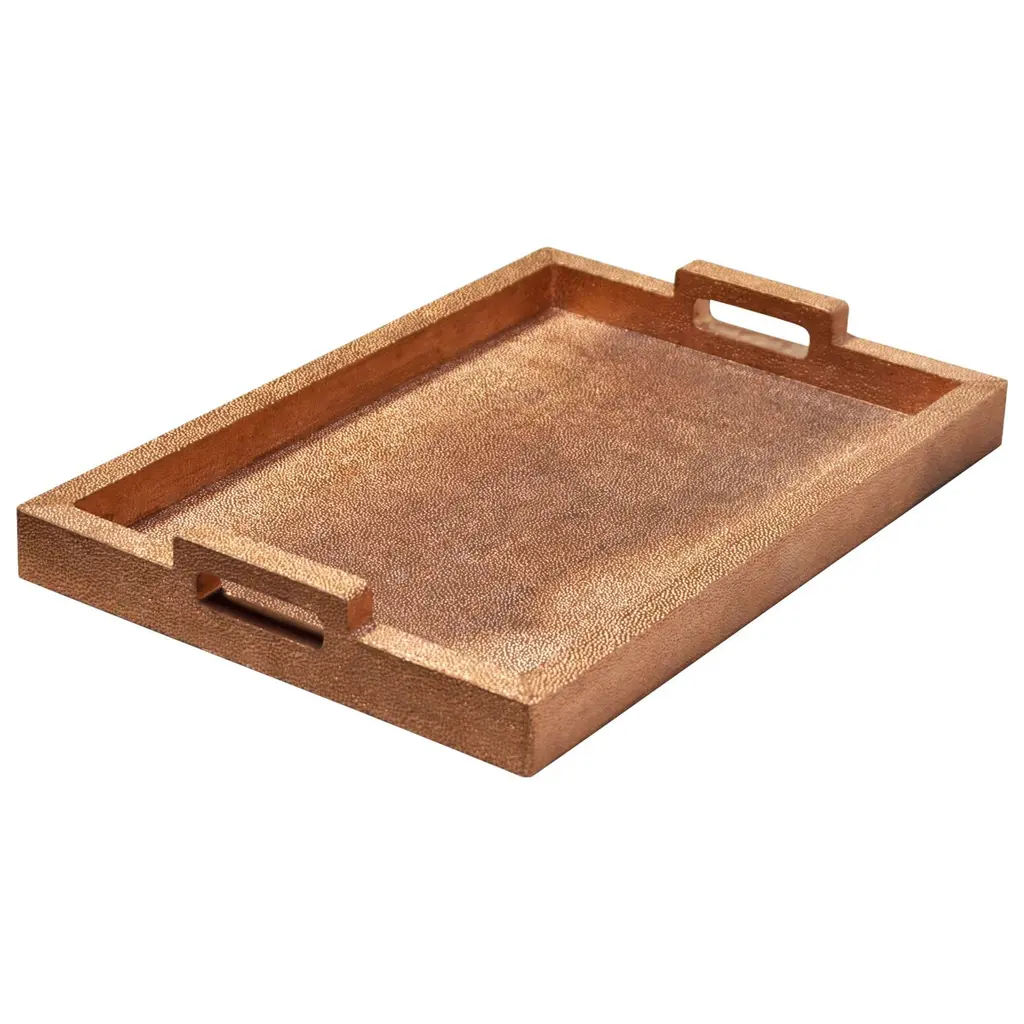 Combining a contemporary design and traditional materials, this tray is a timeless addition to any home, adding a lavish accent to a cocktail bar or providing a luxurious base for permanently displayed collectibles in a living room, entryway, or study. The wooden rectangular silhouette is covered with leather in a rich brown shade that complements the 24k gold that covers the metal handles. The base has an anti-slip surface.