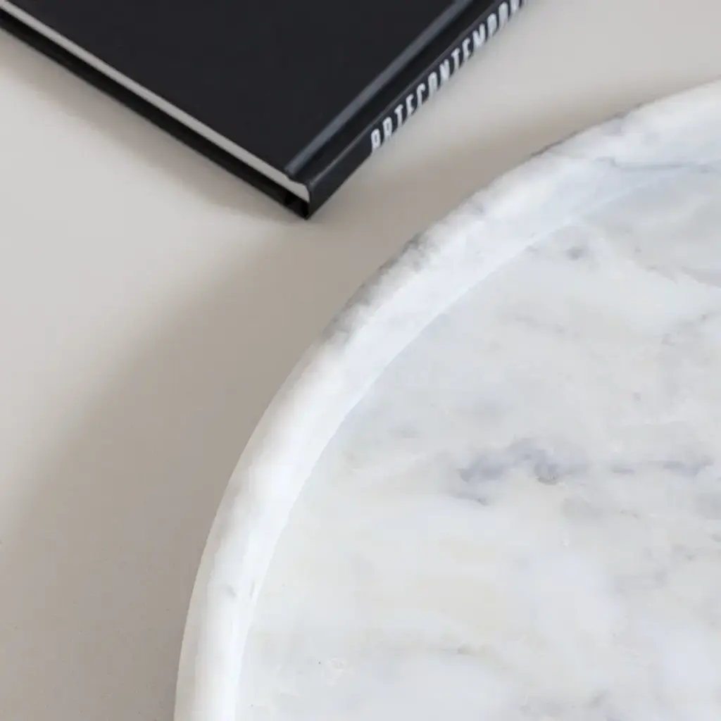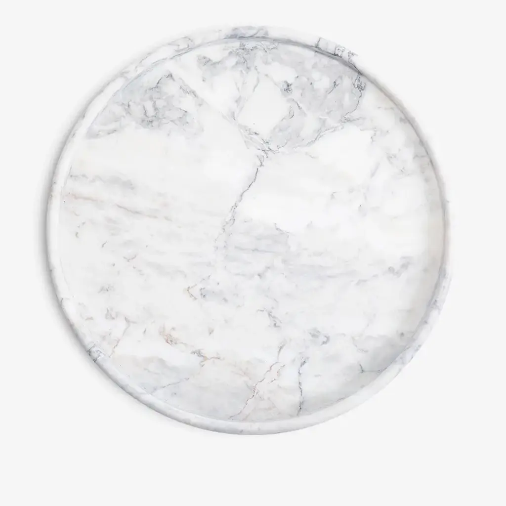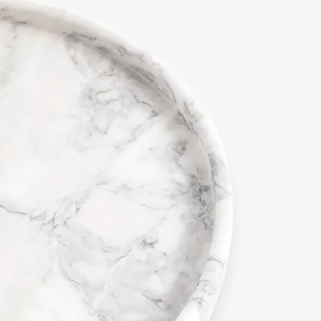 Thania is the perfect marble tray: round, linear, beautiful, designed to highlight all the veins and the brilliance of the material which seems to shine with its own light, creating inimitable streaks in each piece. When simplicity takes shape, it assumes the indispensable appearance of this practical and extremely useful object, essential for both its functionality and elegance which denote style and class by decorating any setting.Round tray in Carrara White marble with a beveled edge, obtained from processing a single block using CNC workstation. Surfaces smoothed and treated with stain-resistant products.