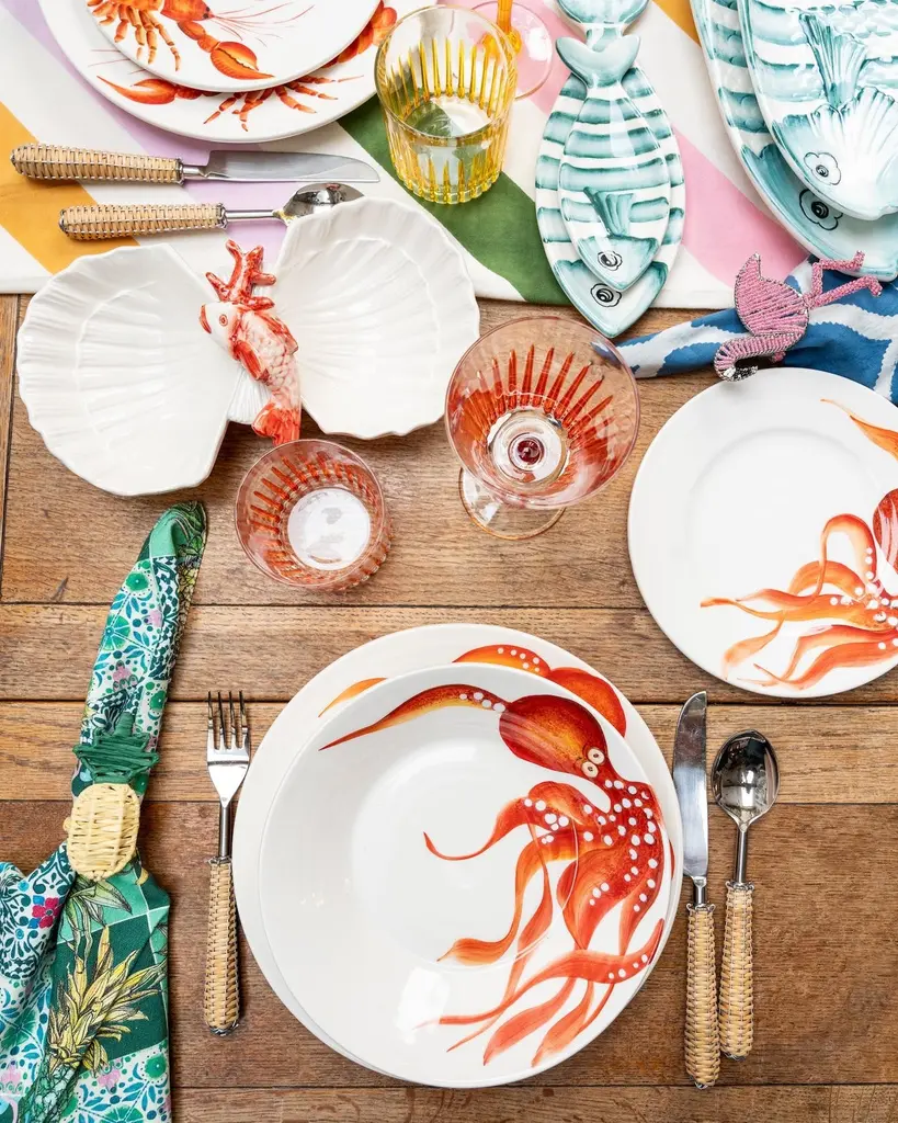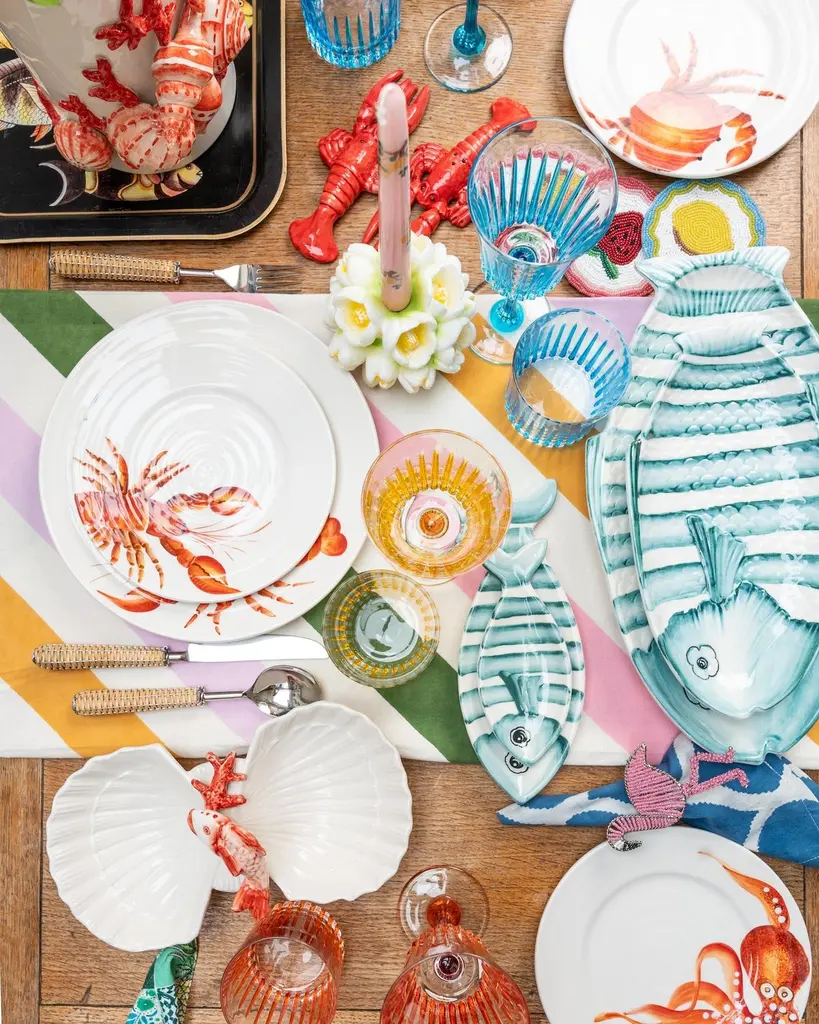 Celebrate the beauty of the sea with The Fishes ceramic tray, hand-crafted and hand-painted in the shape of a fish. Featuring charming fish motifs rendered with expressive brushstrokes and vibrant colors, each tray is a one-of-a-kind piece that brings character and a playful marine touch to your table or interior décor.Expertly hand-painted by skilled artisans, this tray is perfect for serving appetisers, side dishes, or simply used as a decorative centrepiece. Its unique shape and artisanal finish make it a standout addition to any coastal-inspired setting.Each piece is unique due to the hand-painted nature of the design—variations in detail and color are part of its charm.Available in four sizes, ideal for everything from individual portions to shared platters or display.