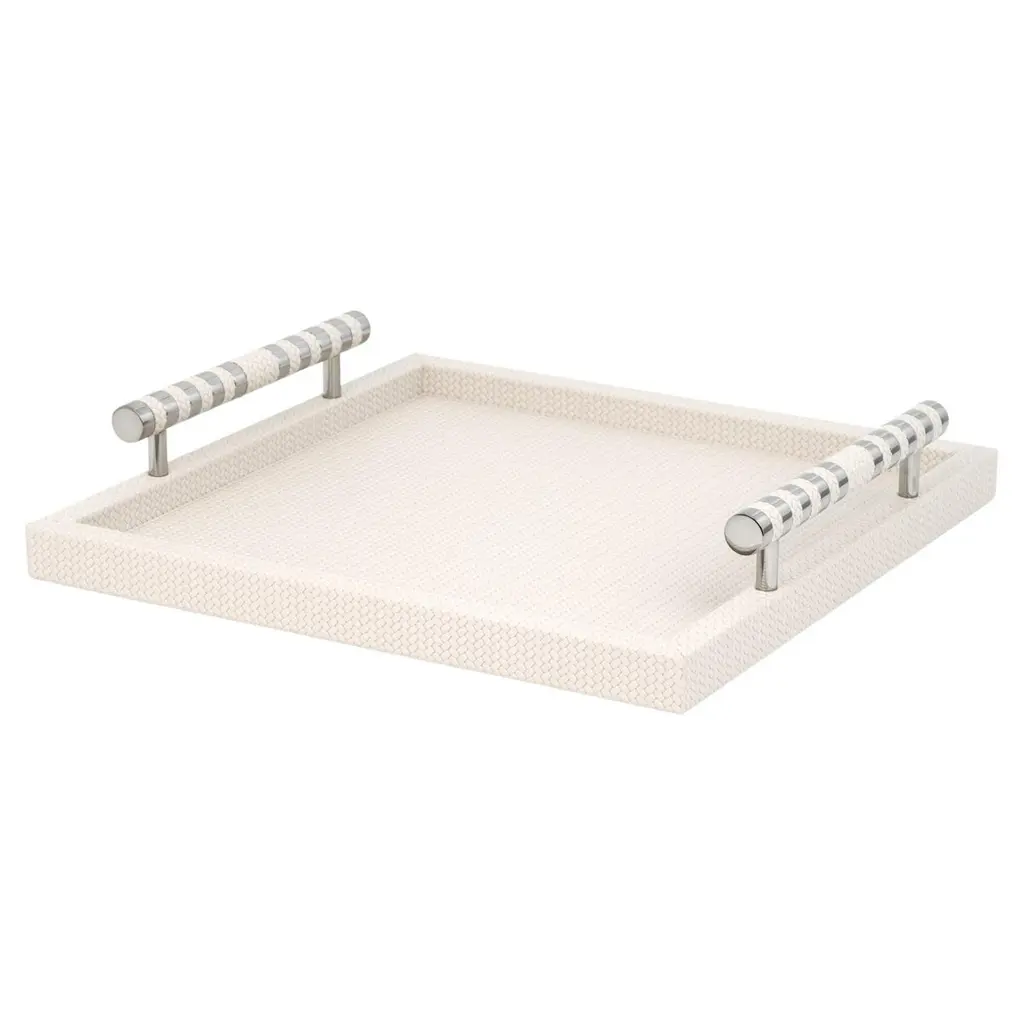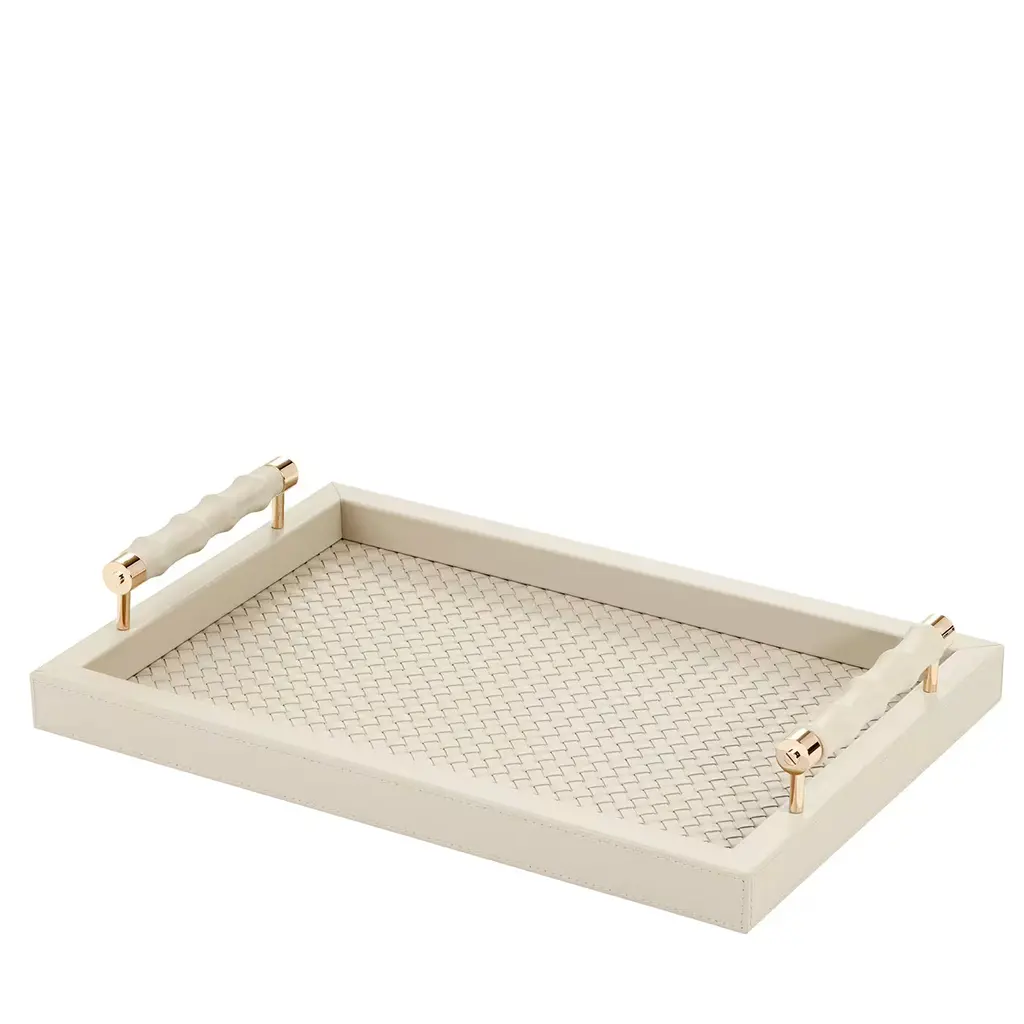 Lacquered tray with hand-braided leather railing and chrome or gold details. A simple shape featuring minimal, modern lines together with precious metals and hand-braided leather create fine, elegant everyday pieces, perfect for every environment.