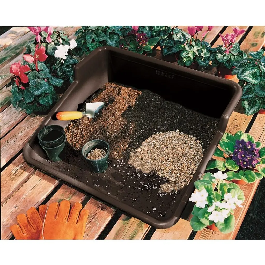 An indispensable garden accessory, this durable one-piece potting tray ensures a clean gardening experience! Ideal for indoor gardening without any mess, it's also perfect for use in the garage or as a children's play station. Made from 100% recycled plastic, it measures 24.5 inches in length, 22 inches in width, and 8 inches in height at the back of the tray, with the front standing 2.5 inches tall, and weighs 3.25 pounds.