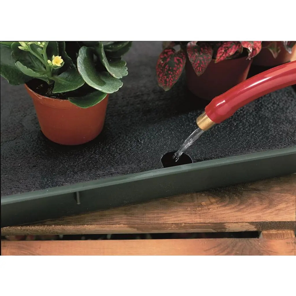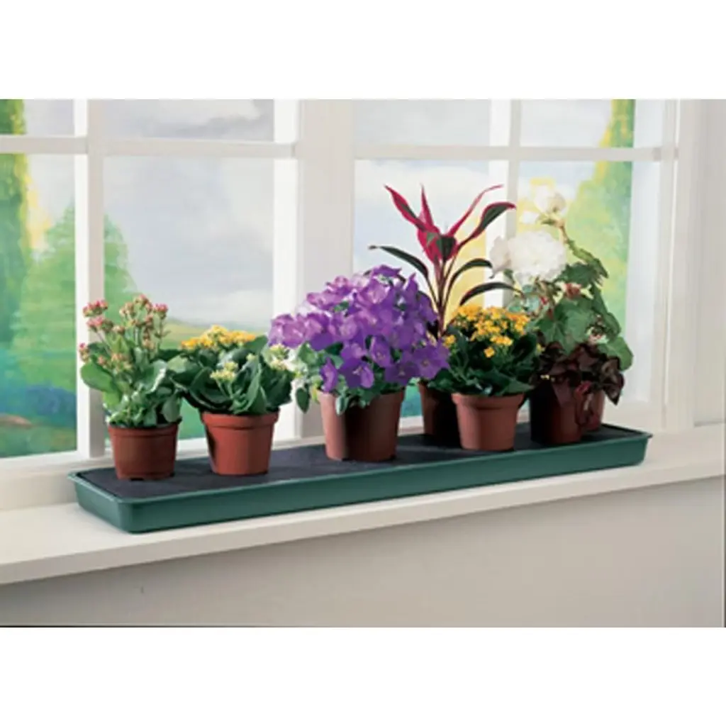 Windowsills can provide the perfect light conditions for indoor plants. A windowsill-sized, self-watering tray serves as an excellent holiday watering solution. Once filled, it can keep potted plants hydrated for up to 14 days. The design includes a base reservoir tray with a 'stilted' inner support platform, topped with capillary matting. This base tray holds up to 1 gallon of water. Ensuring that the compost exposed at the bottom contacts the capillary matting allows the plants to self-water. Dimensions: 30"L x 7"W x 1.5"H; Weight: 2.7lbs; Water reservoir: 1 gallon.