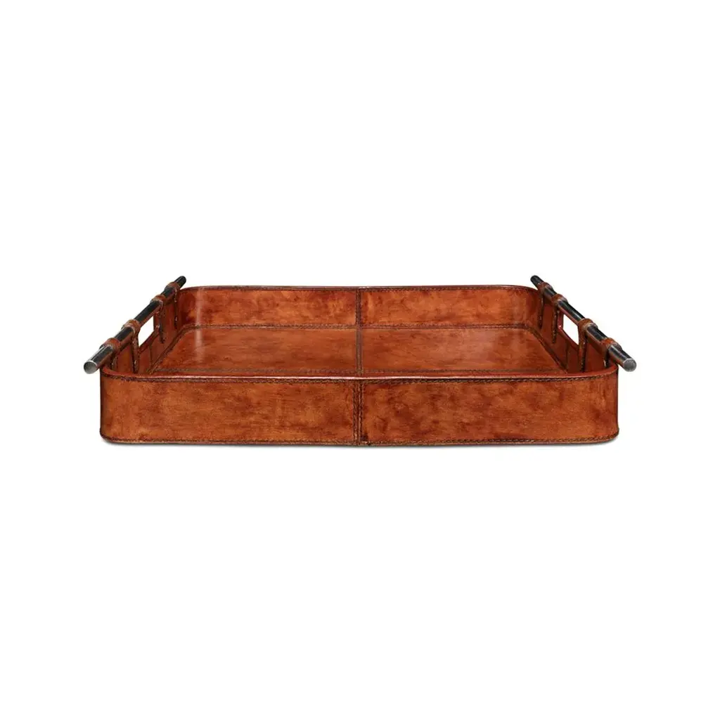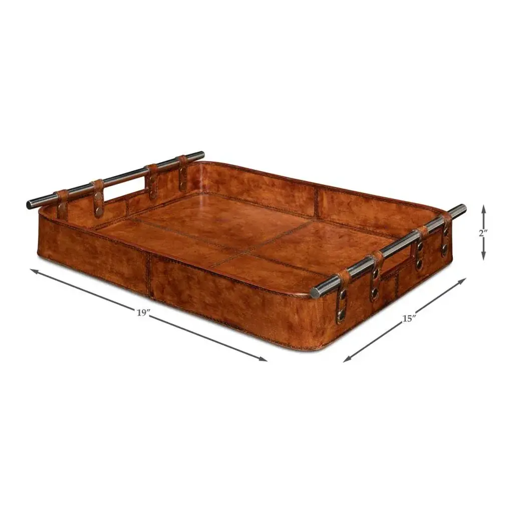 With Tobacco brown leather, this leather tray is fraught with detail: the topstitching of each leather panel, the narrow leather straps that hold the stainless steel handles in place. Dimensions: 19" W x 15" D x 2" H