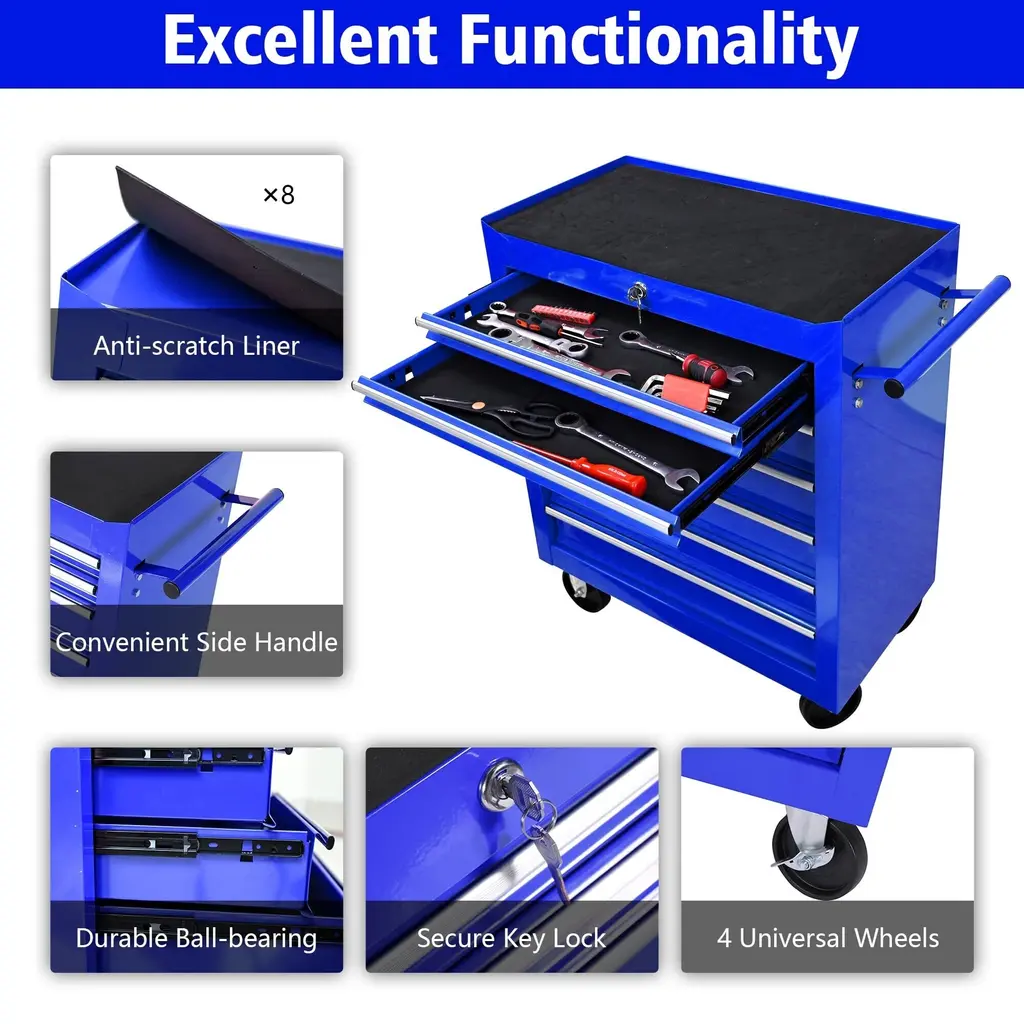Tool Chest, 7-Drawer Rolling Tool Chest With Locking System & Detachable Tray - Blue