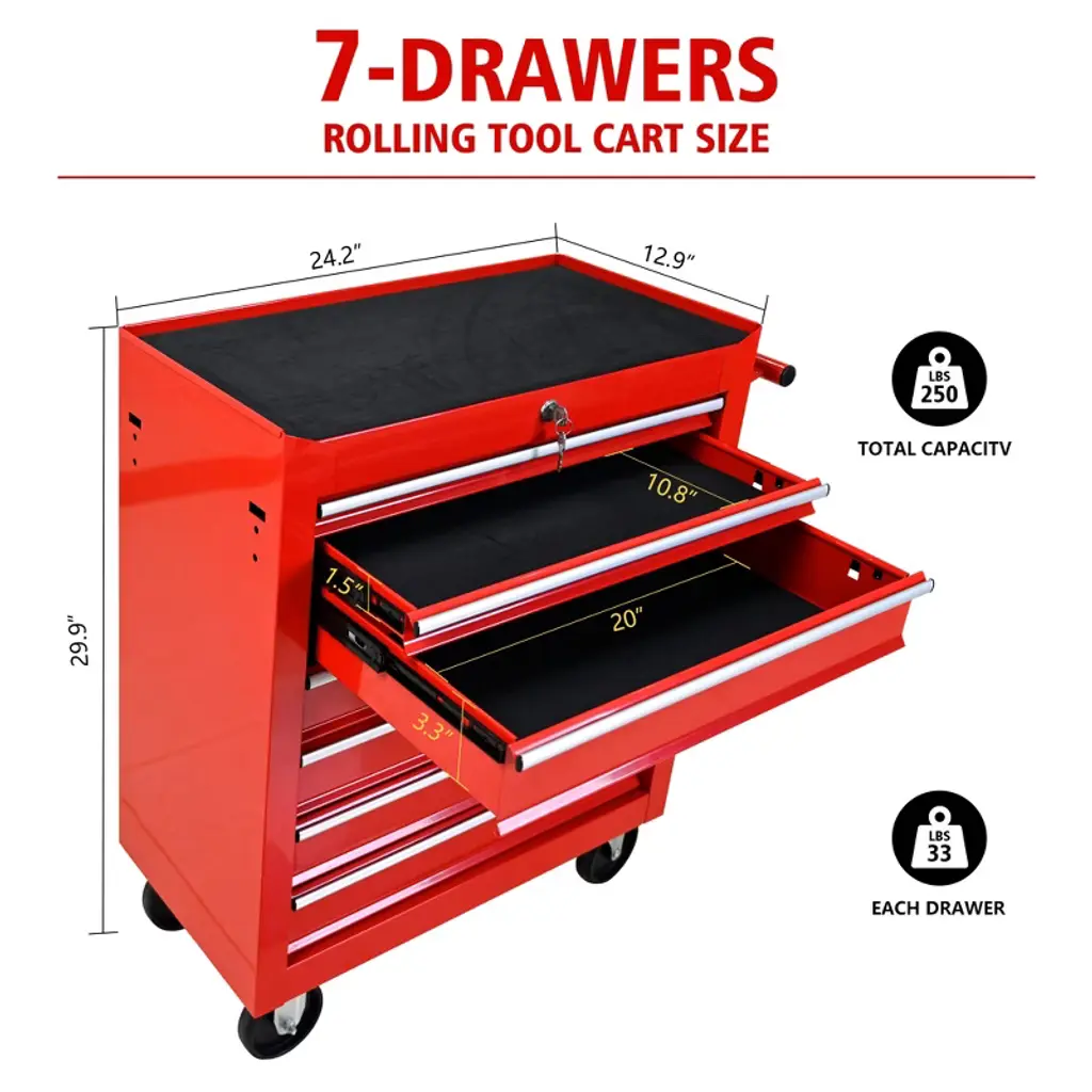 Product DescriptionThis rolling tool chest features a total of 5+2 drawers in various sizes. The flat top offers additional space for your frequently used tools and parts, allowing you to keep your tools organized and easily accessible.Product informationSize: 24.2 x 12.9 x 29.9 inchesItem Weight: 69.78 PoundsMaterial: MetalColor: RedPacking List:1 x Storage Cabinet