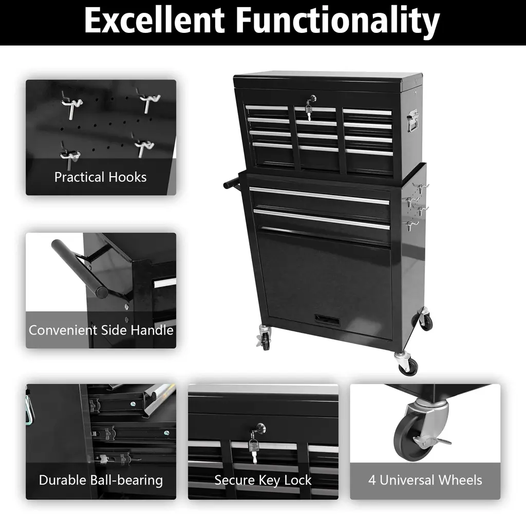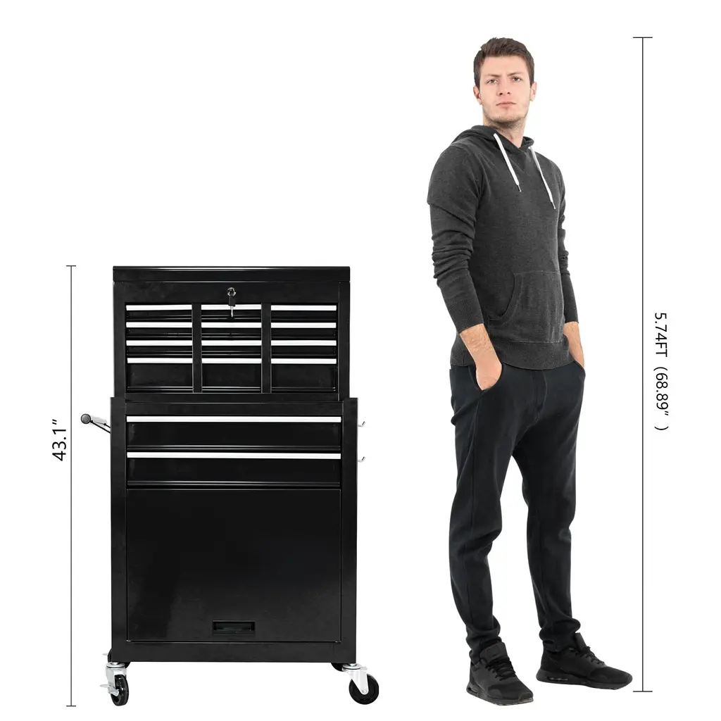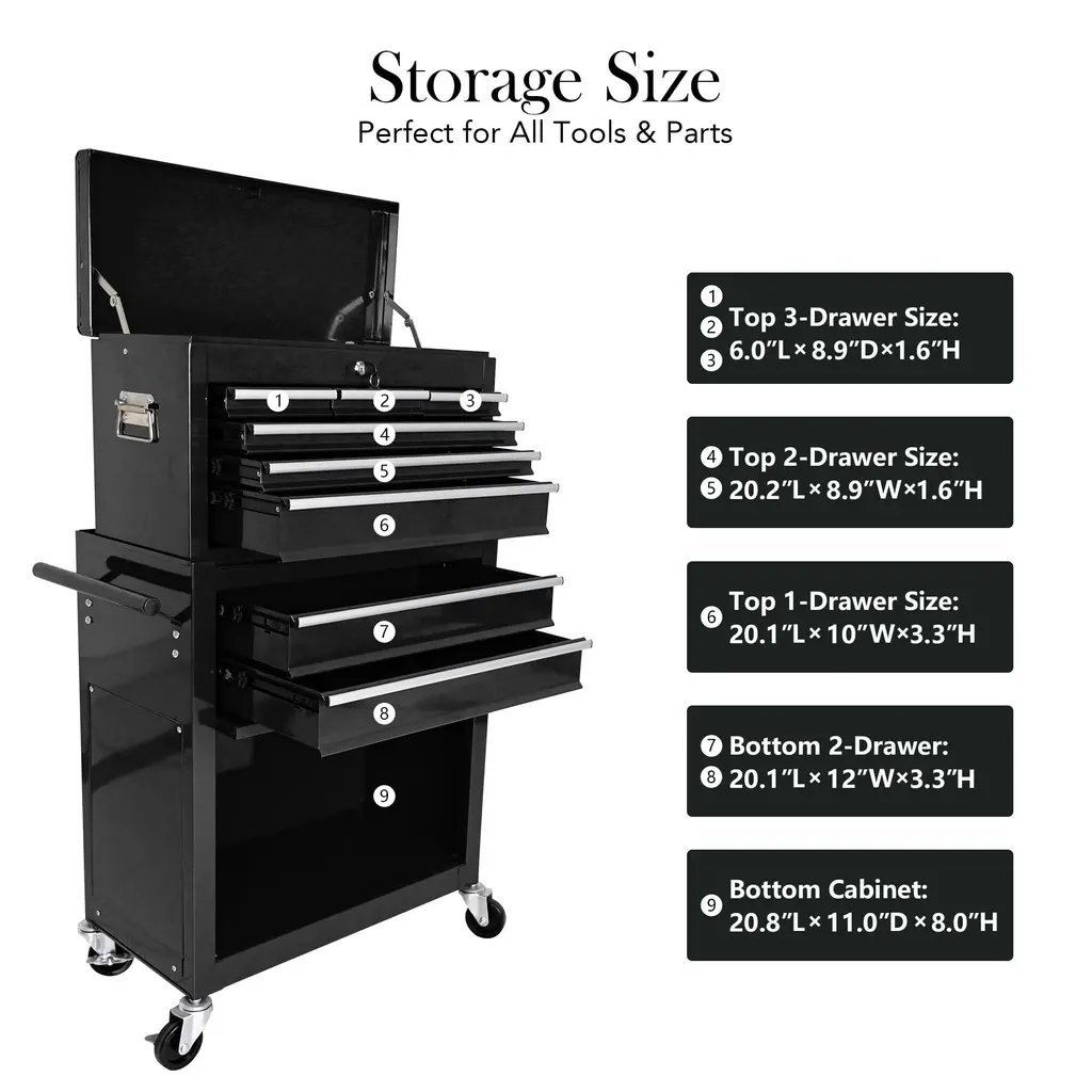 TOOL CHEST HIGH CAPACITY: This rolling tool chest features 8 sliding drawers, including 2 large, 3 medium, and 3 small drawers, along with a top layer and bottom cabinet, providing ample space for tools of various sizes. Each drawer is lined, and there are 8 hooks on the side for additional tool storage. Additionally, 7 storage boxes are provided to cater to diverse storage needs. EASY TO TIDY: Constructed from rustproof, scratch-resistant, and easy-to-clean materials, this rolling tool chest with padding inside the drawers for excellent cushioning and heat insulation, protecting the tools from damage. EASY TO MOVE & STORE: The tool chest with drawers with 2 handles on the top box and hand bars on the bottom cabinet, this tool chest is easy to lift and move around. The presence of 4 universal casters, 2 of which are braked, enables effortless mobility and storage. STURDY & DURABLE: Crafted from premium steel with a powder coating, this tool chest boasts a stable construction that prevents scratching, denting, and chipping, enhancing its durability. The classic color design adds a touch of elegance. Moreover, the detachable design allows it to be divided into a top tool box and bottom tool cart, each with an independent locking system. ADVANCED DESIGN: The garage tool box drawers are equipped with smooth slide rails for easy opening and closing. Both the top and bottom tool boxes can be locked using keys, ensuring the security of the tools stored inside.