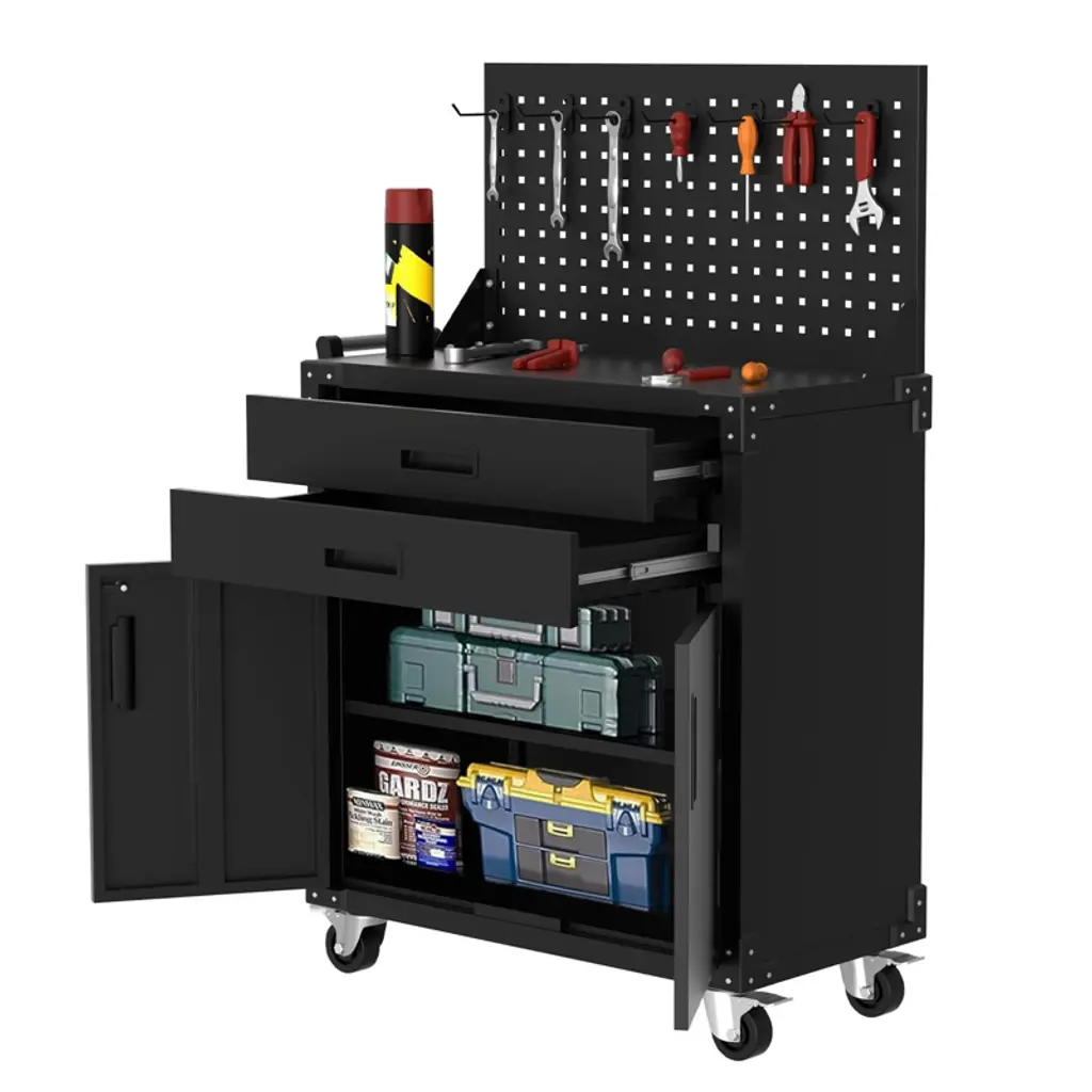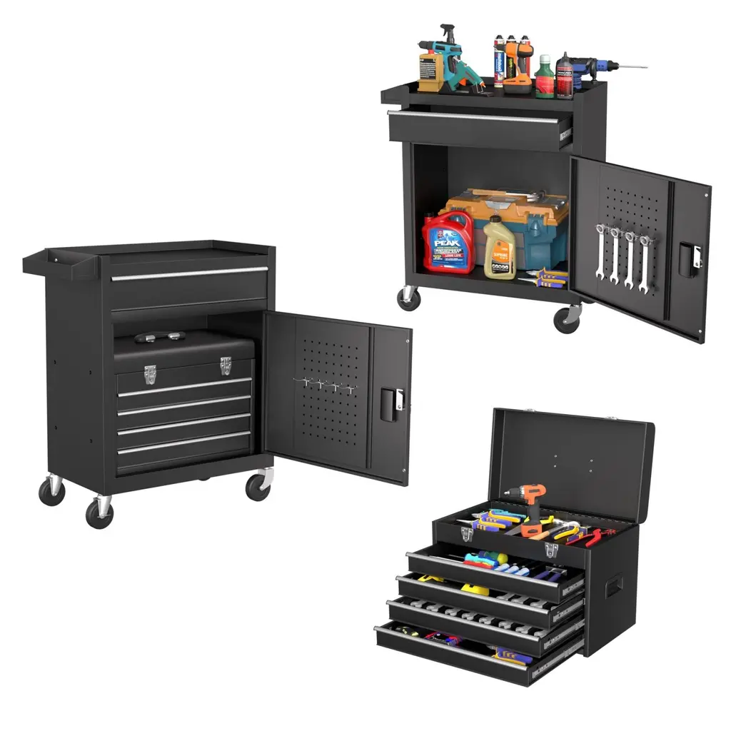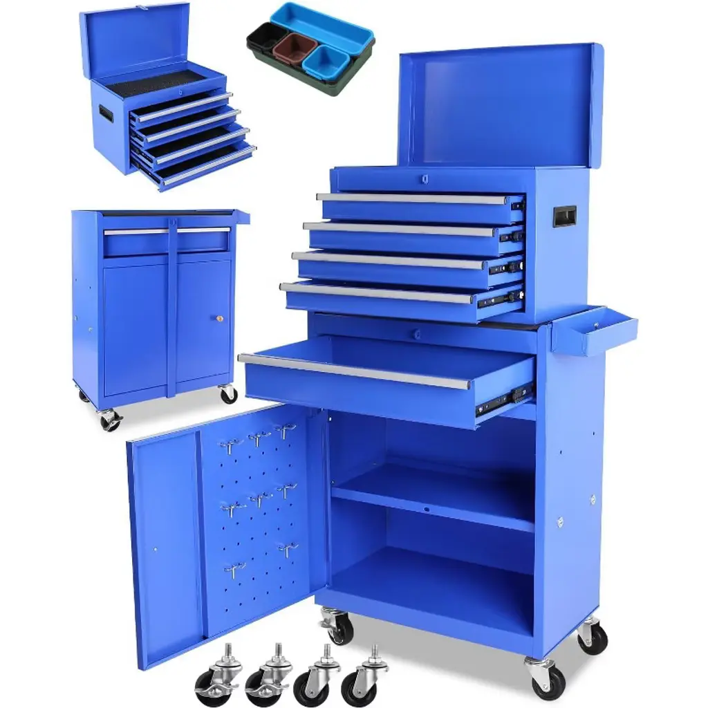 TOOL CHEST HIGH CAPACITY: This rolling tool chest features 8 sliding drawers, including 2 large, 3 medium, and 3 small drawers, along with a top layer and bottom cabinet, providing ample space for tools of various sizes. Each drawer is lined, and there are 8 hooks on the side for additional tool storage. Additionally, 7 storage boxes are provided to cater to diverse storage needs. EASY TO TIDY: Constructed from rustproof, scratch-resistant, and easy-to-clean materials, this rolling tool chest with padding inside the drawers for excellent cushioning and heat insulation, protecting the tools from damage. EASY TO MOVE & STORE: The tool chest with drawers with 2 handles on the top box and hand bars on the bottom cabinet, this tool chest is easy to lift and move around. The presence of 4 universal casters, 2 of which are braked, enables effortless mobility and storage. STURDY & DURABLE: Crafted from premium steel with a powder coating, this tool chest boasts a stable construction that prevents scratching, denting, and chipping, enhancing its durability. The classic color design adds a touch of elegance. Moreover, the detachable design allows it to be divided into a top tool box and bottom tool cart, each with an independent locking system. ADVANCED DESIGN: The garage tool box drawers are equipped with smooth slide rails for easy opening and closing. Both the top and bottom tool boxes can be locked using keys, ensuring the security of the tools stored inside.