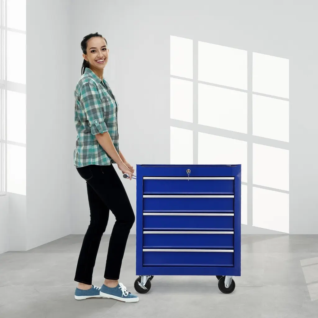 ✔ STURDY CONSTRUCTION:This tool chest is made of steel with a powder-coated surface for enhanced abrasion resistance. Amazing weight capacity, this toolbox can hold heavy tools and equipment without any strain on the structure.5 drawer Tool cart overall size about:24.2"Lx13"Dx30"H. ✔ AMPLE STORAGE SPACE:The rolling toolbox with 5 drawers.Each drawer is solid,deep smooth drawers accommodate all your tools perfectly. Plus,each drawer is removable and lockable, ensuring secure storage and organization of tools. Drawer dimensions(WxHxD):20.2"x4"x10.5". ✔ TOOL CART ON WHEELS WITH TOOL DRAWER ORGANIZER:This mobile tool chest come with tools organizer trays that not only suitable for toolboxes, but these tray dividers also work wonders in desk drawers, providing a neat and tidy storage solution for office supplies and small items. Tray divider size:235 x 160 x 45mm (1pcs),235 x 75 x 45mm (3pcs),75 x 75 x 45mm(3pcs). ✔ EASY TO MOVE GARAGE TOOL BOX ON WHEELS:This rolling tool box with four 360-degree rotation casters let you maneuver the tool chest right where you need it, and two of them with the brake to keep the chest from moving while you work. Equipped with a side handle, it is comfortable and helps to move the cart easily. ✔ WIDE APPLICATIONS:This mechanics tool cart is great for home workshops and some professional environments and could be placed in the garage, workshop, warehouse, etc. You can keep your tools orderly so that you can easily find the tools you need. Its exquisite appearance also makes it suitable as a piece of furniture.
