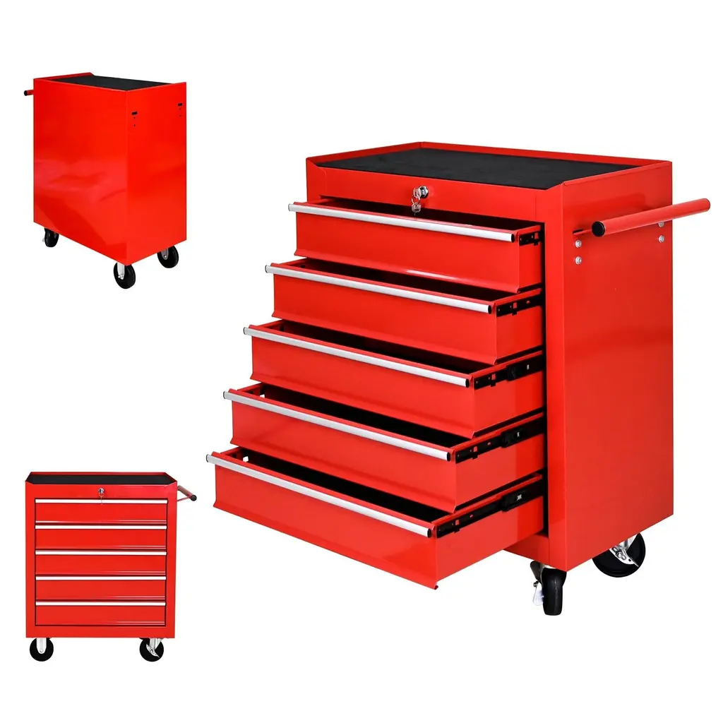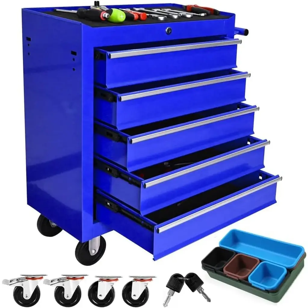 ✔ STURDY CONSTRUCTION:This tool chest is made of steel with a powder-coated surface for enhanced abrasion resistance. Amazing weight capacity, this toolbox can hold heavy tools and equipment without any strain on the structure.5 drawer Tool cart overall size about:24.2"Lx13"Dx30"H. ✔ AMPLE STORAGE SPACE:The rolling toolbox with 5 drawers.Each drawer is solid,deep smooth drawers accommodate all your tools perfectly. Plus,each drawer is removable and lockable, ensuring secure storage and organization of tools. Drawer dimensions(WxHxD):20.2"x4"x10.5". ✔ TOOL CART ON WHEELS WITH TOOL DRAWER ORGANIZER:This mobile tool chest come with tools organizer trays that not only suitable for toolboxes, but these tray dividers also work wonders in desk drawers, providing a neat and tidy storage solution for office supplies and small items. Tray divider size:235 x 160 x 45mm (1pcs),235 x 75 x 45mm (3pcs),75 x 75 x 45mm(3pcs). ✔ EASY TO MOVE GARAGE TOOL BOX ON WHEELS:This rolling tool box with four 360-degree rotation casters let you maneuver the tool chest right where you need it, and two of them with the brake to keep the chest from moving while you work. Equipped with a side handle, it is comfortable and helps to move the cart easily. ✔ WIDE APPLICATIONS:This mechanics tool cart is great for home workshops and some professional environments and could be placed in the garage, workshop, warehouse, etc. You can keep your tools orderly so that you can easily find the tools you need. Its exquisite appearance also makes it suitable as a piece of furniture.