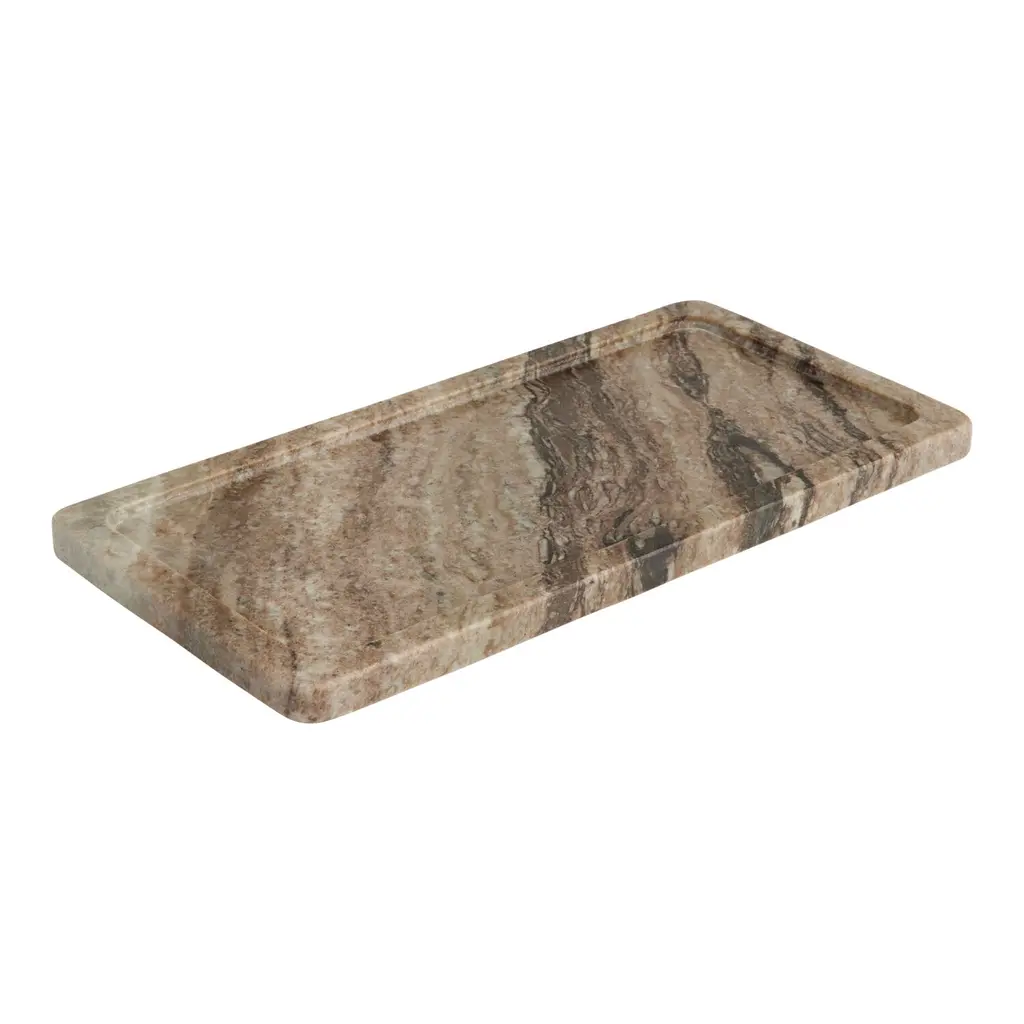 Our exclusive vanity tray showcases the natural beauty and subtle variations of genuine Toronto brown marble. Made to elevate your bathroom decor with simple elegance, this chic brown and white marble trinket tray can be used as a catchall for everything from jewelry and hair accessories to beauty products and fragrances.