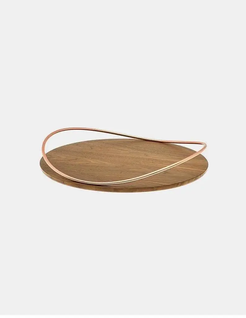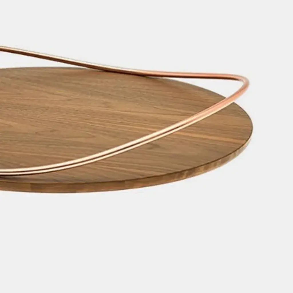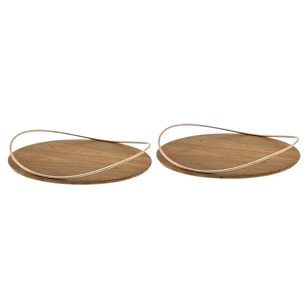 Pair of touché bois canaletto by mason editions dimensions: d 36 cm materials: walnut canaletto wood. A light metal rod that rests on the surface and then lifts up, almost touching the surface with a quick tap, a movement that defines the handles of touché trays. The organic shape of the oval base communicates with the thin tubular, giving the impression of a perpetual undulatory motion, which seems to vanish when the trays are looked at from above. This oval tray with a round handle won’t go unnoticed in the eyes of your party and dinner guests. The round mdf base is available in several colours, with a slim handle in galvanized 24k gold. A sleek design that adds a touch of luxury to your dining experience.