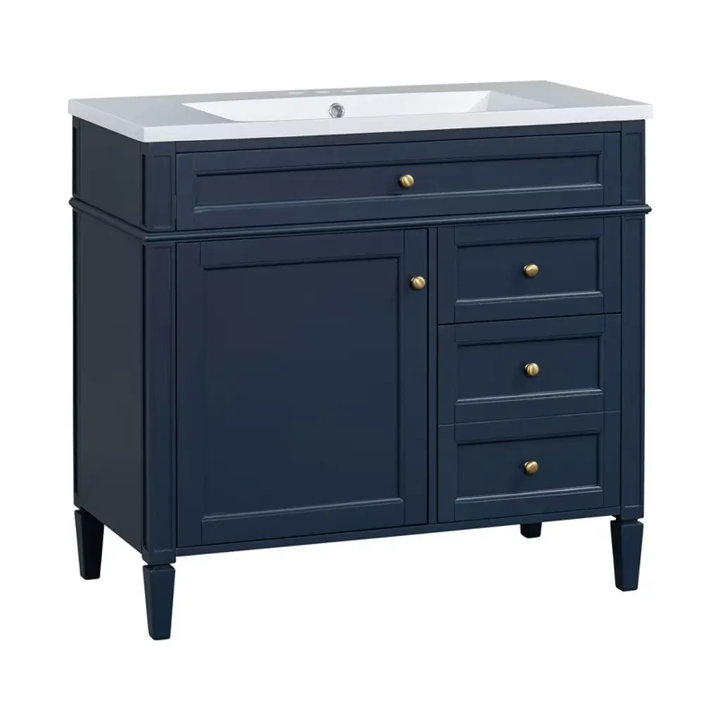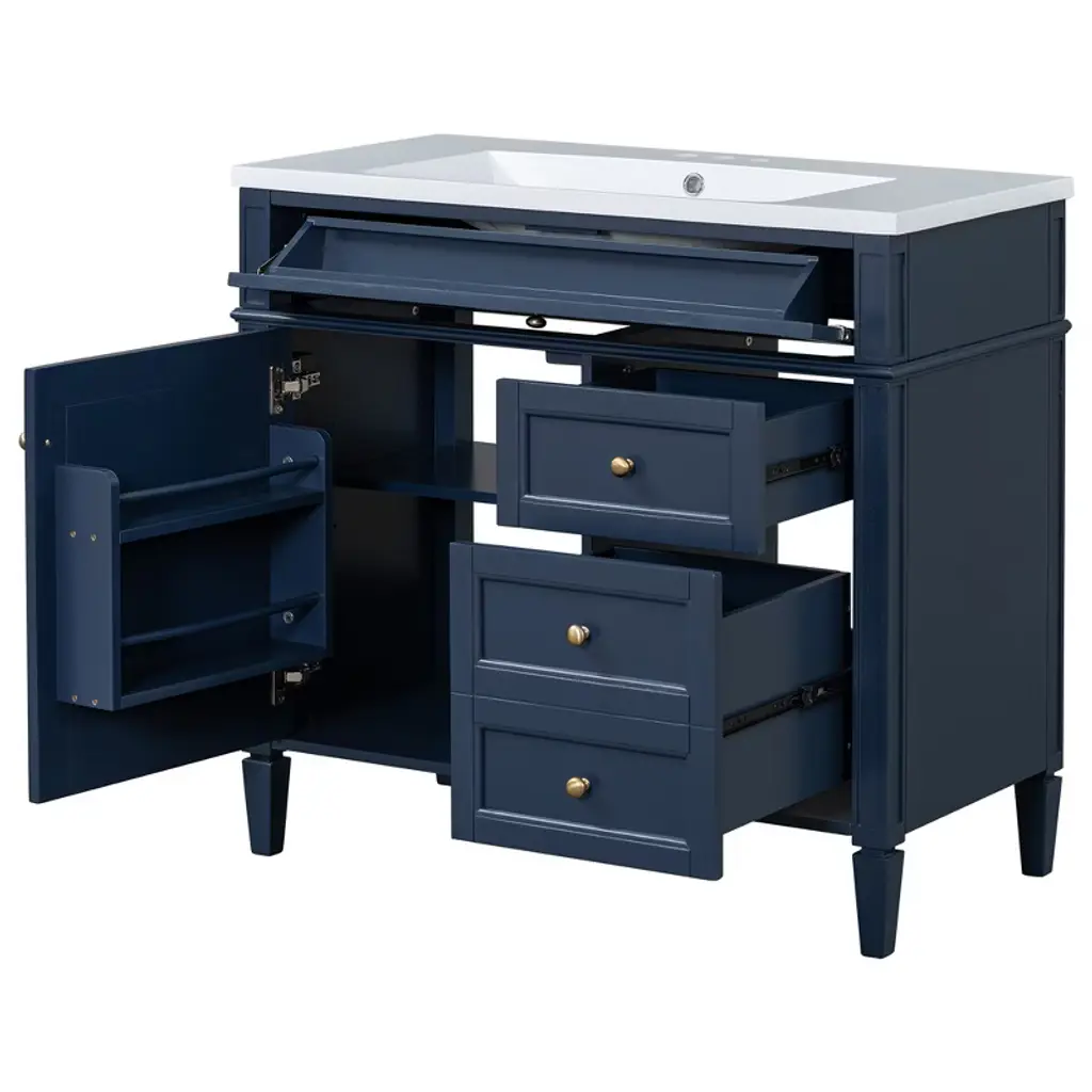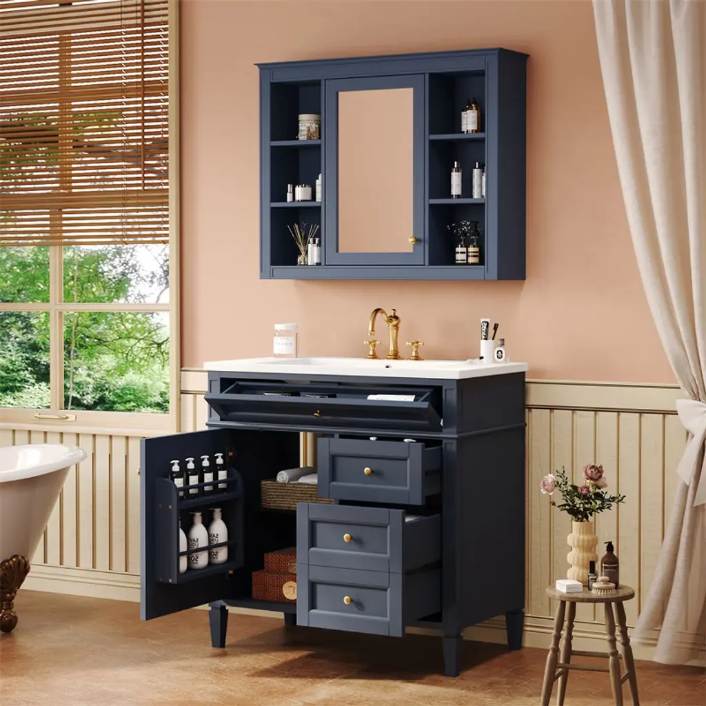 Tramull Blue Modern Bathroom Vanity Set With Sink Top, Mirror Storage Cabinet, 2 Drawers & Tip-out Tray, Soft-close Door
