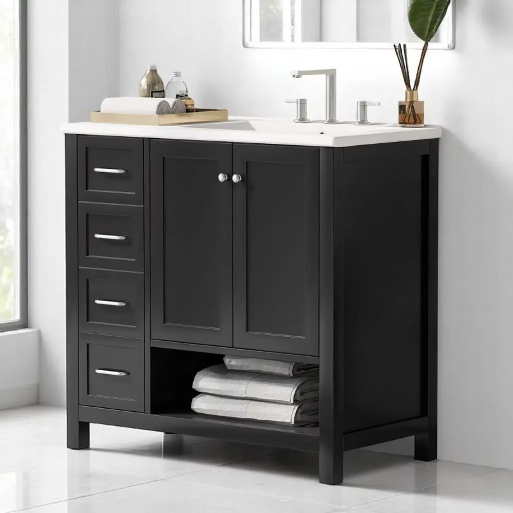 Transform your bathroom with this modern vanity set featuring an integrated sink top and a matching wall-mounted mirror cabinet. The vanity¡¯s distinctive design offers visual elegance under bathroom lighting, combining sophisticated style with highly functional storage. Its freestanding construction makes it a versatile centerpiece for any bathroom layout.