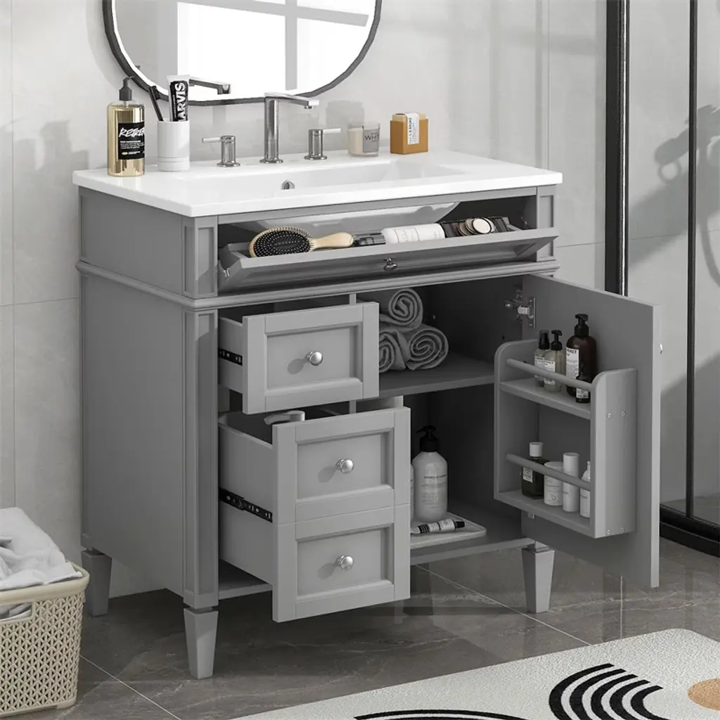 This elegant bathroom vanity combines a modern minimalist design with practical functionality, featuring a sleek sink top and sophisticated storage options. The unique visual pattern enhances your bathroom¡¯s ambiance under lighting, creating a luxurious atmosphere. With its clean lines and vintage-inspired handles, this vanity elevates any bathroom style while offering reliable daily use.