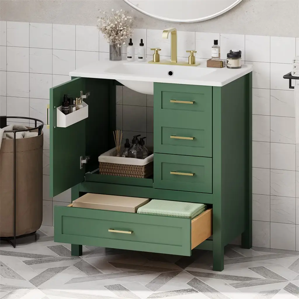 This compact 30-inch vanity maximizes space efficiency, making it ideal for smaller bathrooms. It features an easy-to-clean ceramic basin with a smooth surface and an integrated overflow hole to prevent water spills, ensuring your bathroom remains dry and tidy with minimal maintenance required for daily upkeep.