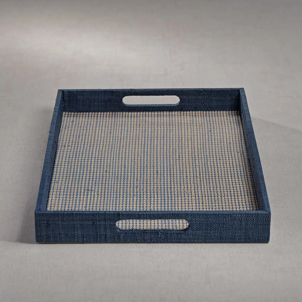 Multifunctional rectangular raffia tray. Whether styling or entertaining , this tray is a useful piece to have in your home. You can use it as a serving piece, or simply display it in a living room or bedroom to hold some of your decorative stuff. Color: Navy Blue Material: Raffia Houndstooth pattern design Woven with 100% natural raffia plant fibers With cut out handles Slight variations may occur Care Instructions: Wipe clean with dry cloth