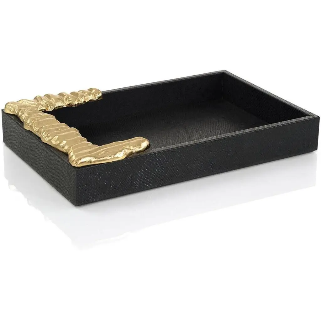 This beautiful, decorative tray made with vegan snakeskin leather is accented with a cast metal in gold sculptural ribbon which will render a sophisticated look to your home's interior.