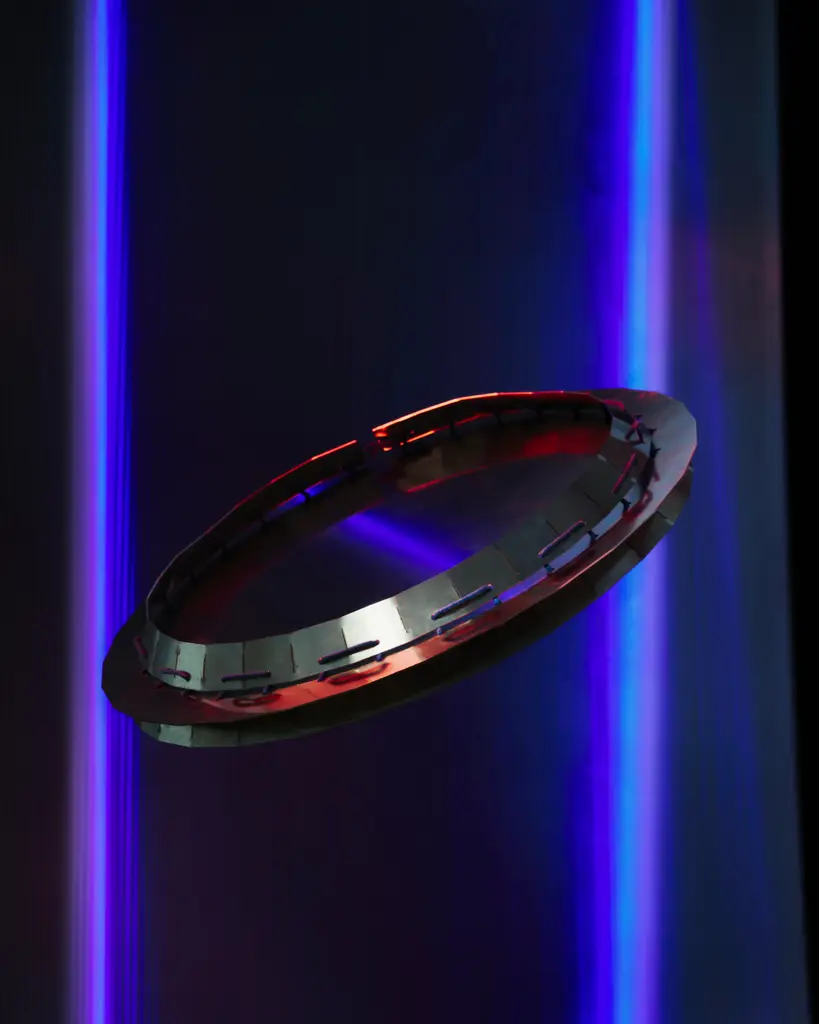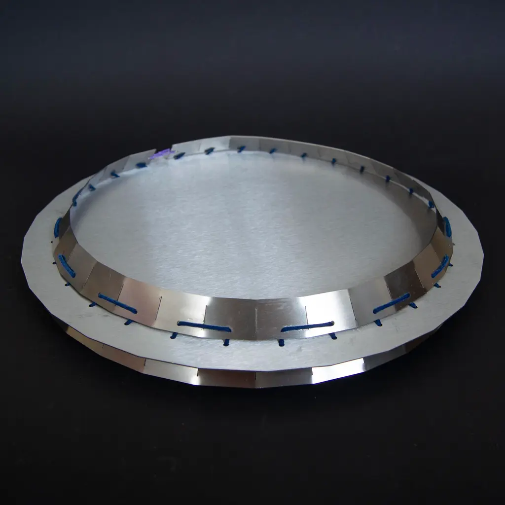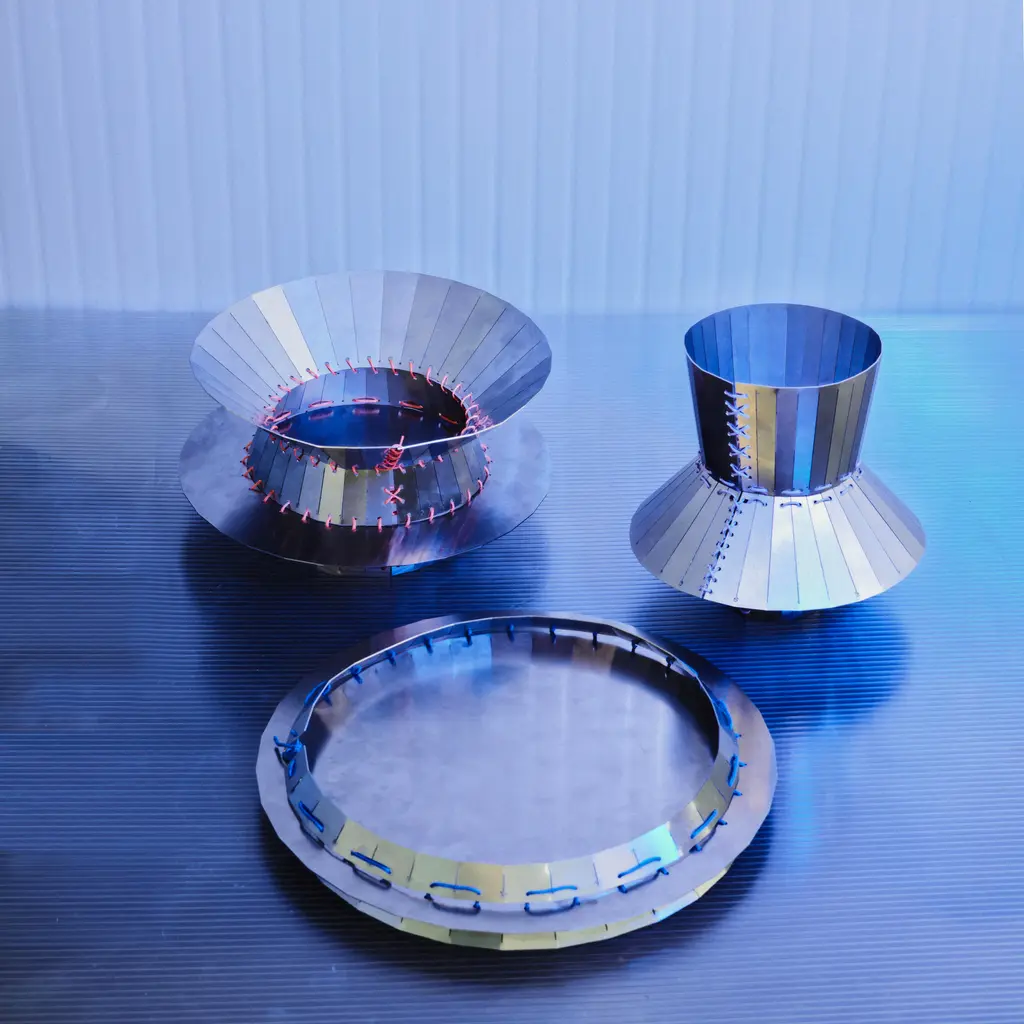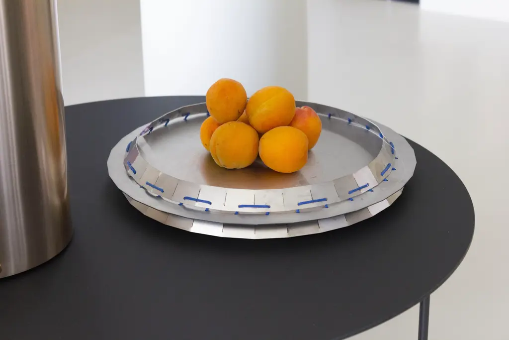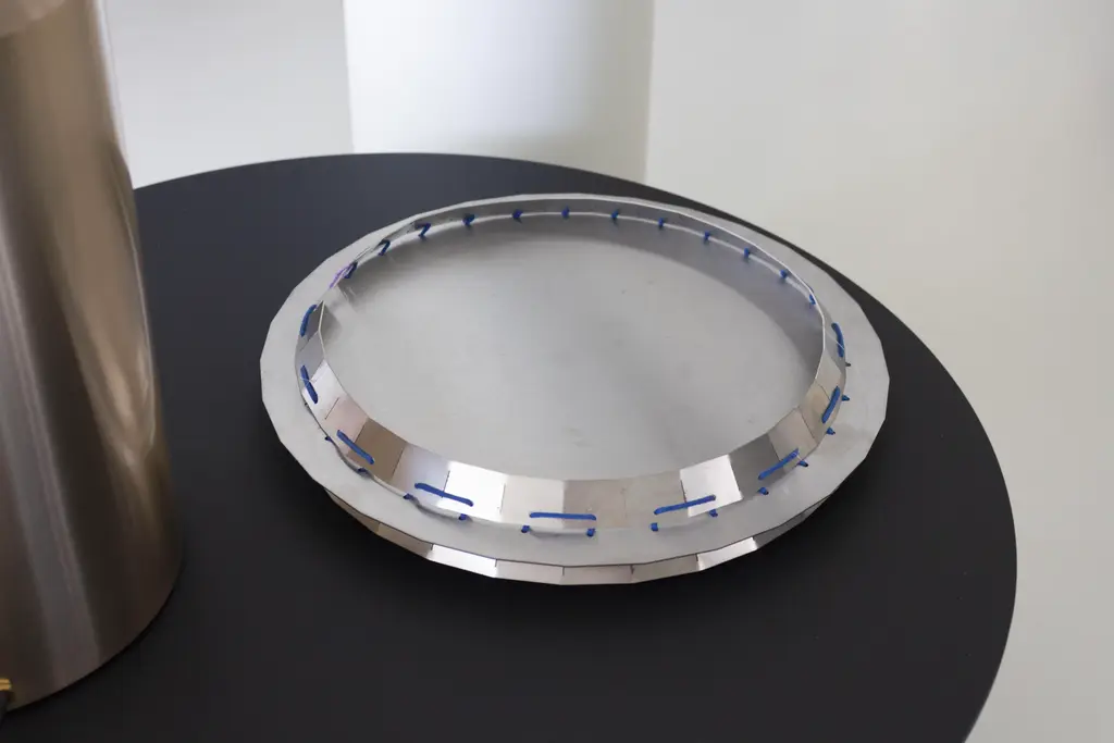 Stainless steel tray from the Minas collection designed by StudioNotte. This tray with clean and faceted shapes is assembled with rope stitching. The entire Minas collection consists of two centerpieces and a tray. These sheet steel accessories are like tight girls in skirts and corsets. Like a two-dimensional fabric that takes shape and is stitched, these folded sheets are assembled from string.