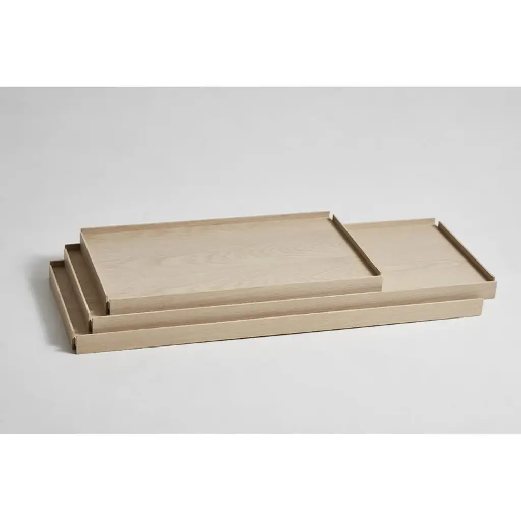 Tray shelf by Woud consists of a thin metal frame and wooden shelves in two sizes: the smaller, tray-like shelves provide space for higher books, vases and other objects. The shelves can be arranged freely on different levels in the frame. Designed by Hanne Willmann, Tray shelves are a harmonious combination of German solid construction and Japanese airy elegance.