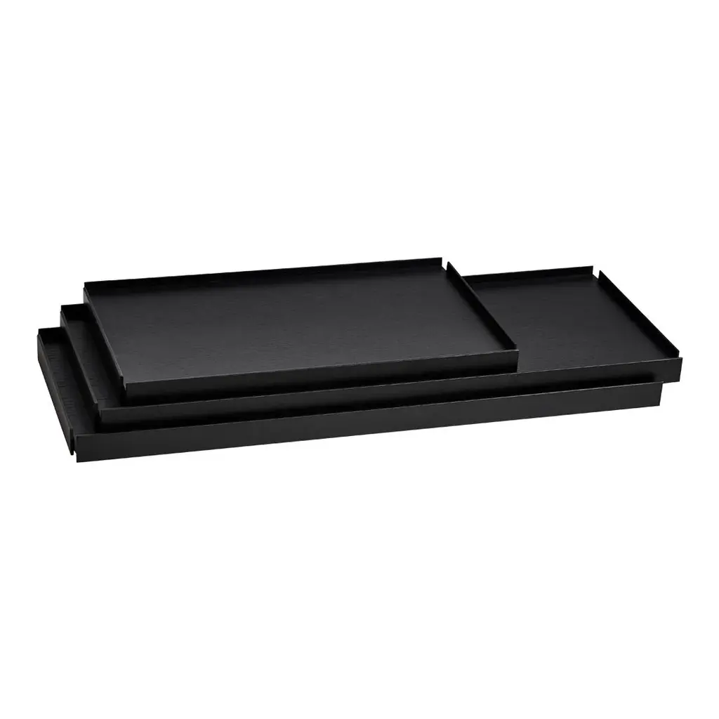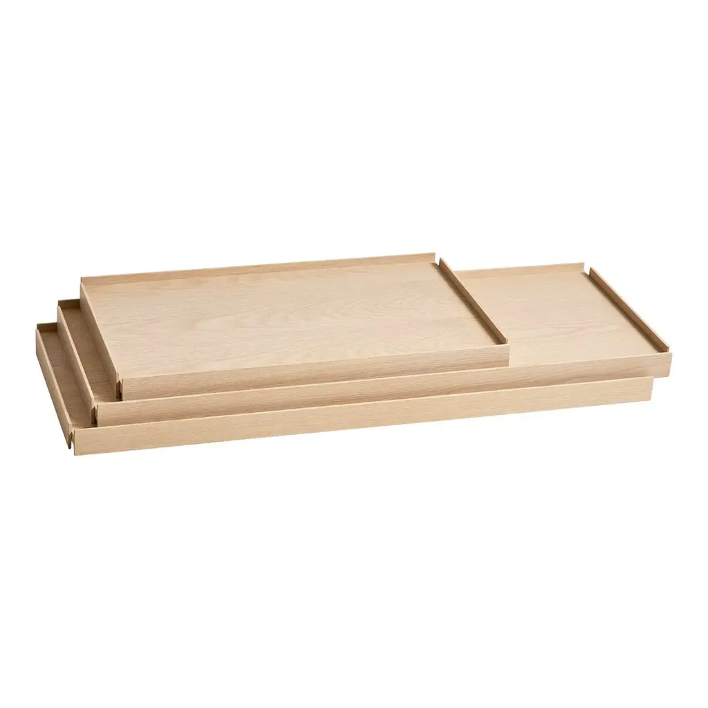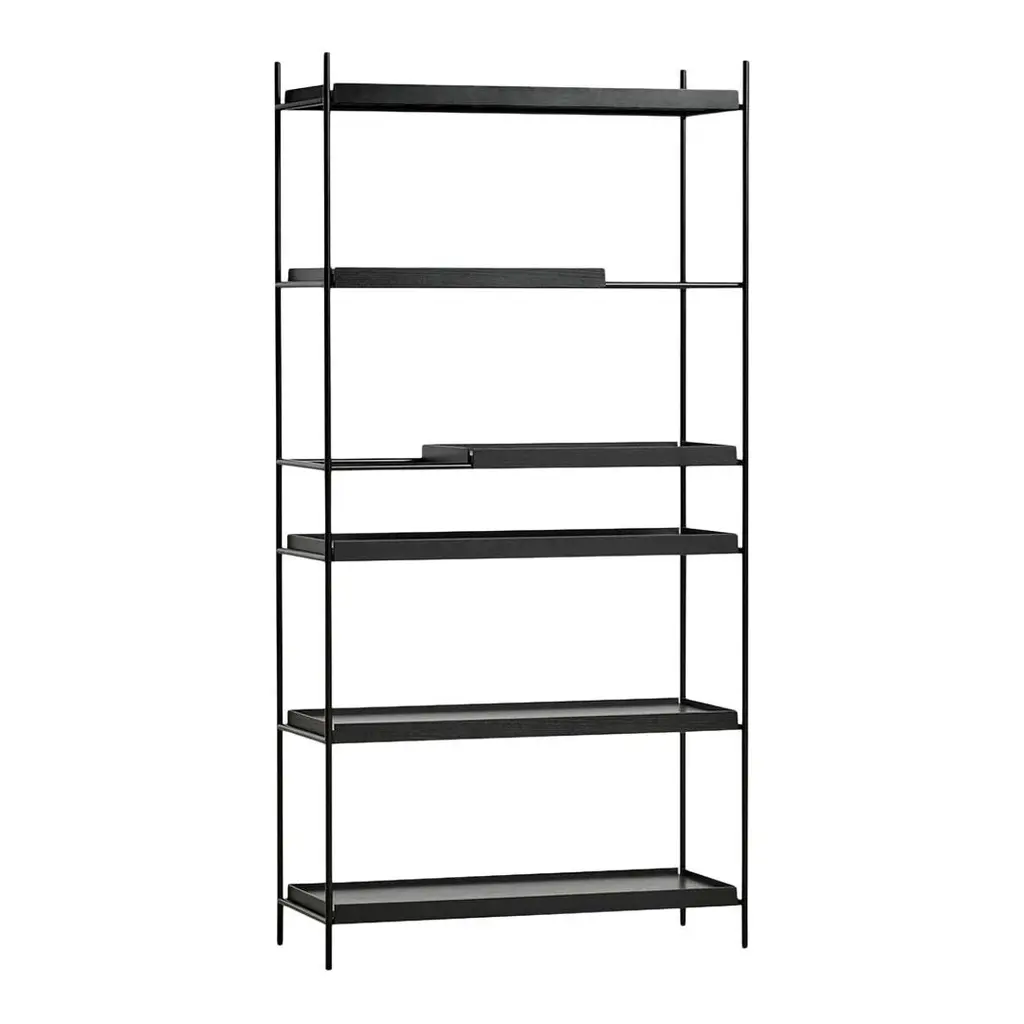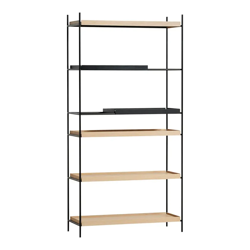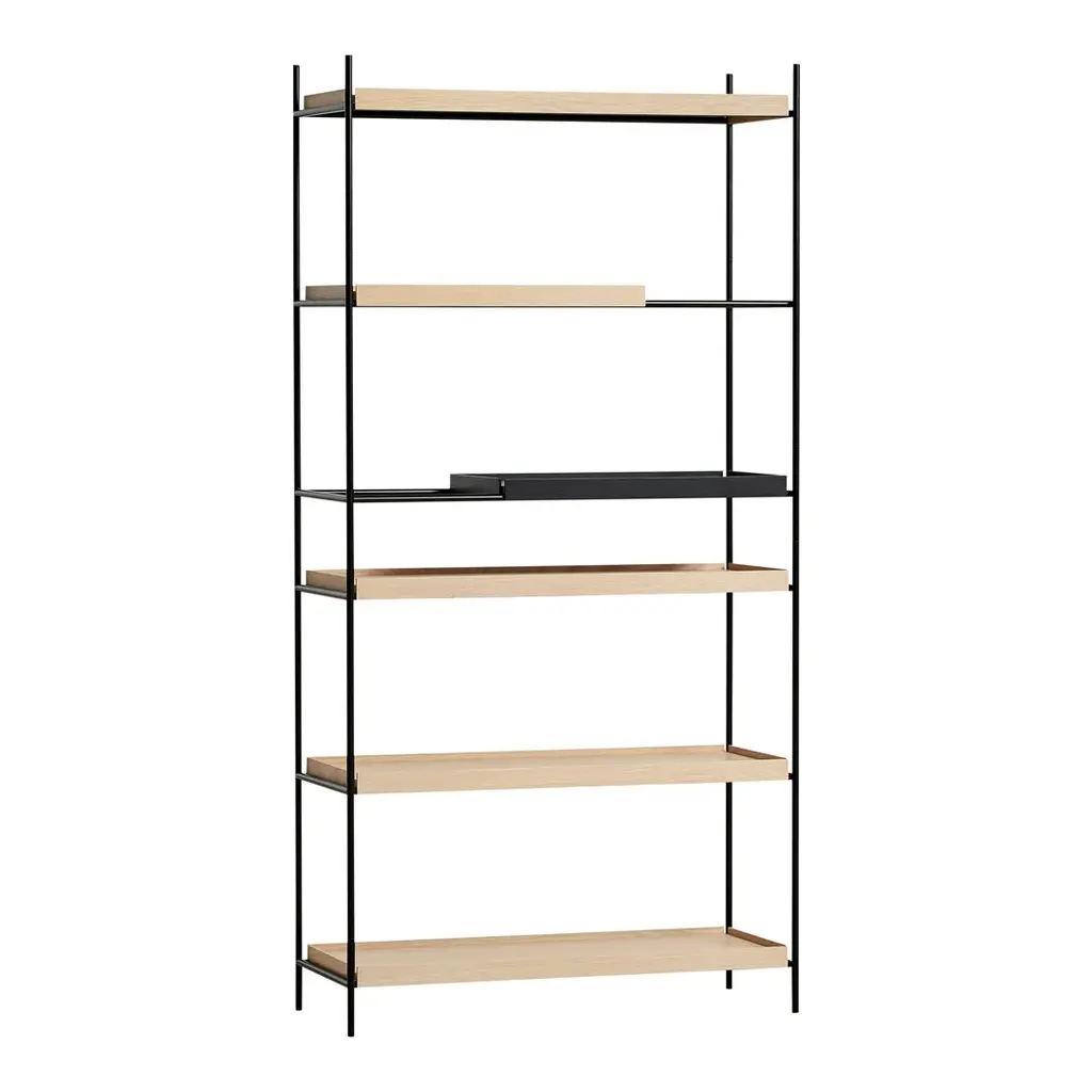 Gaps in the shelving system are created by moving the small trays, which allow taller objects to be placed in the open space. The various possible arrangements of the shelves make the shelving system vivid and personal. Take the trays and place them on the different levels in the frame until you have the arrangement you like. Tray Shelf is Japanese in its elegant expression. German in its solid and thorough construction.