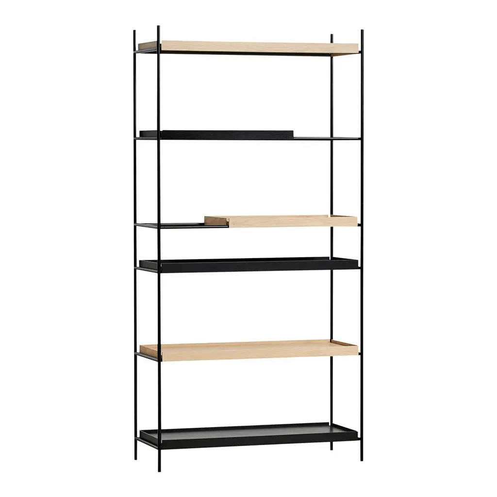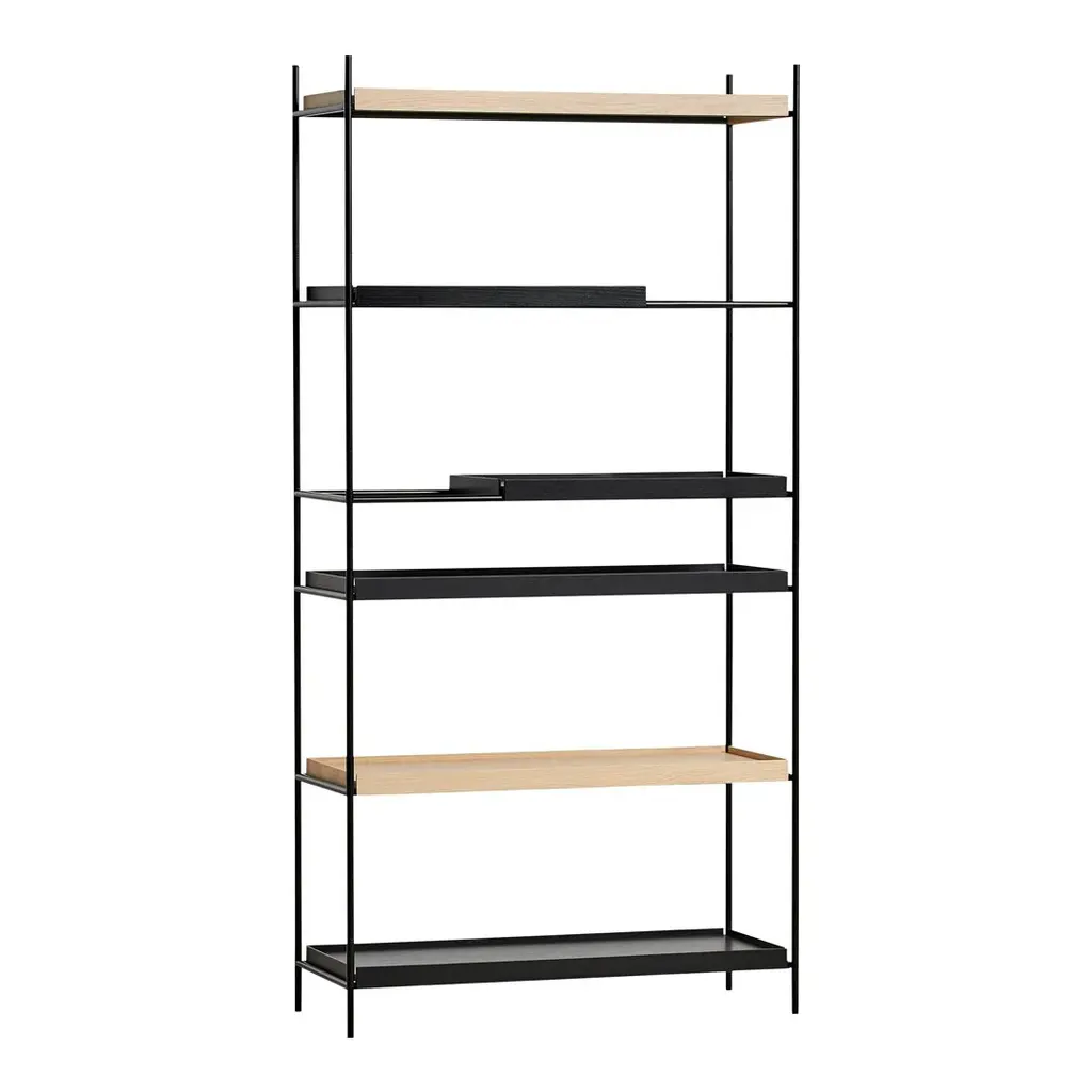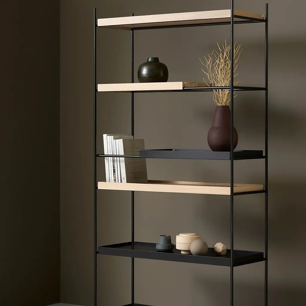 Gaps in the shelving system are created by moving the small trays, which allow taller objects to be placed in the open space. The various possible arrangements of the shelves make the shelving system vivid and personal. Take the trays and place them on the different levels in the frame until you have the arrangement you like. Tray Shelf is Japanese in its elegant expression. German in its solid and thorough construction.