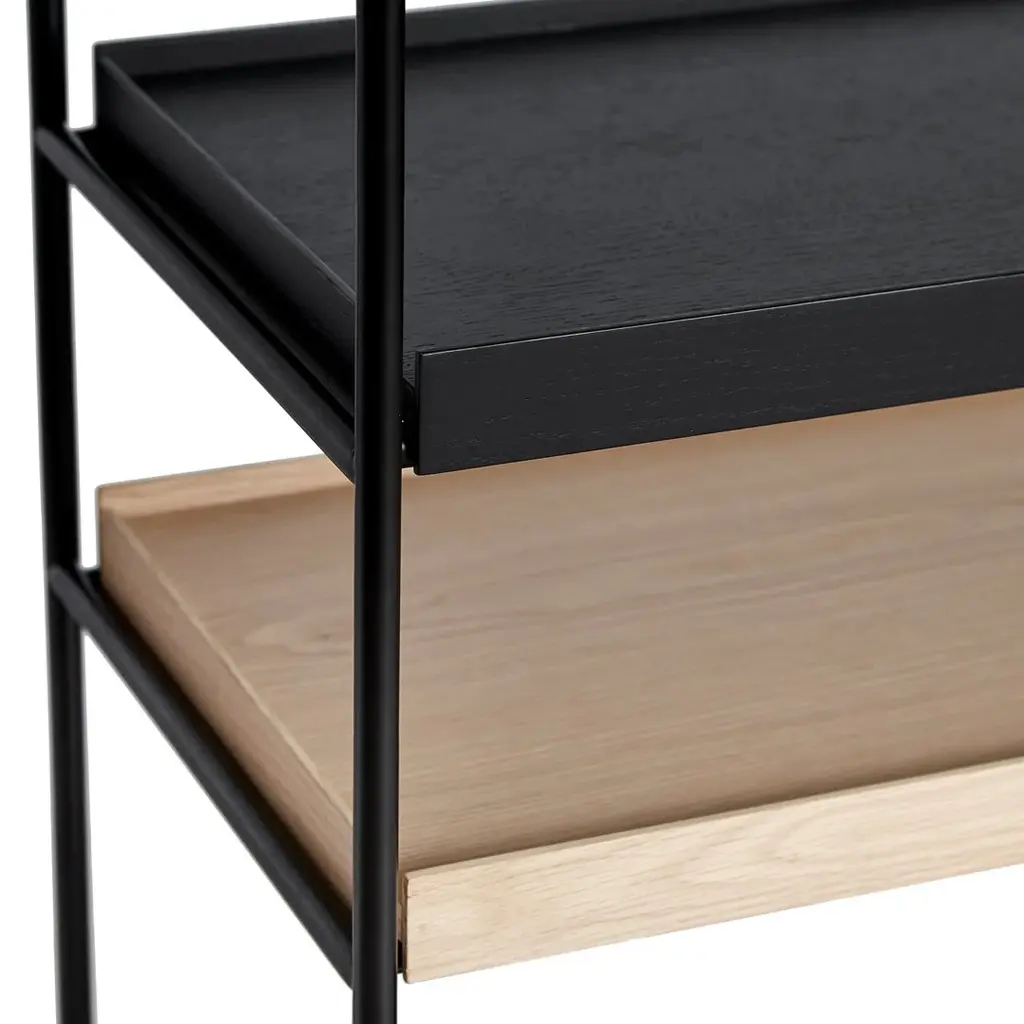 Gaps in the shelving system are created by moving the small trays, which allow taller objects to be placed in the open space. The various possible arrangements of the shelves make the shelving system vivid and personal. Take the trays and place them on the different levels in the frame until you have the arrangement you like. Tray Shelf is Japanese in its elegant expression. German in its solid and thorough construction.