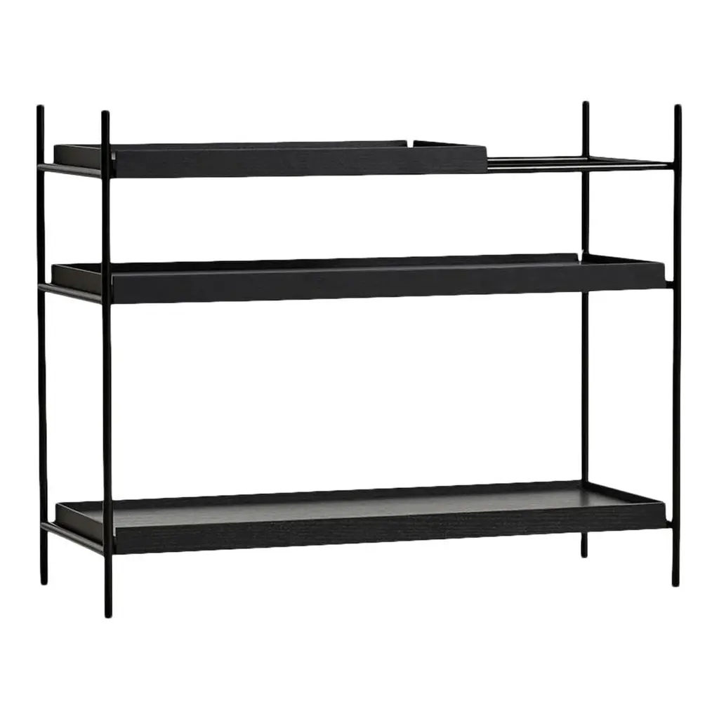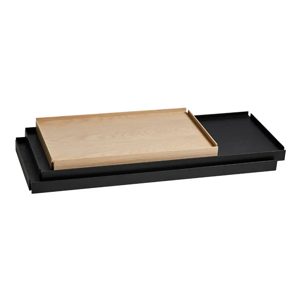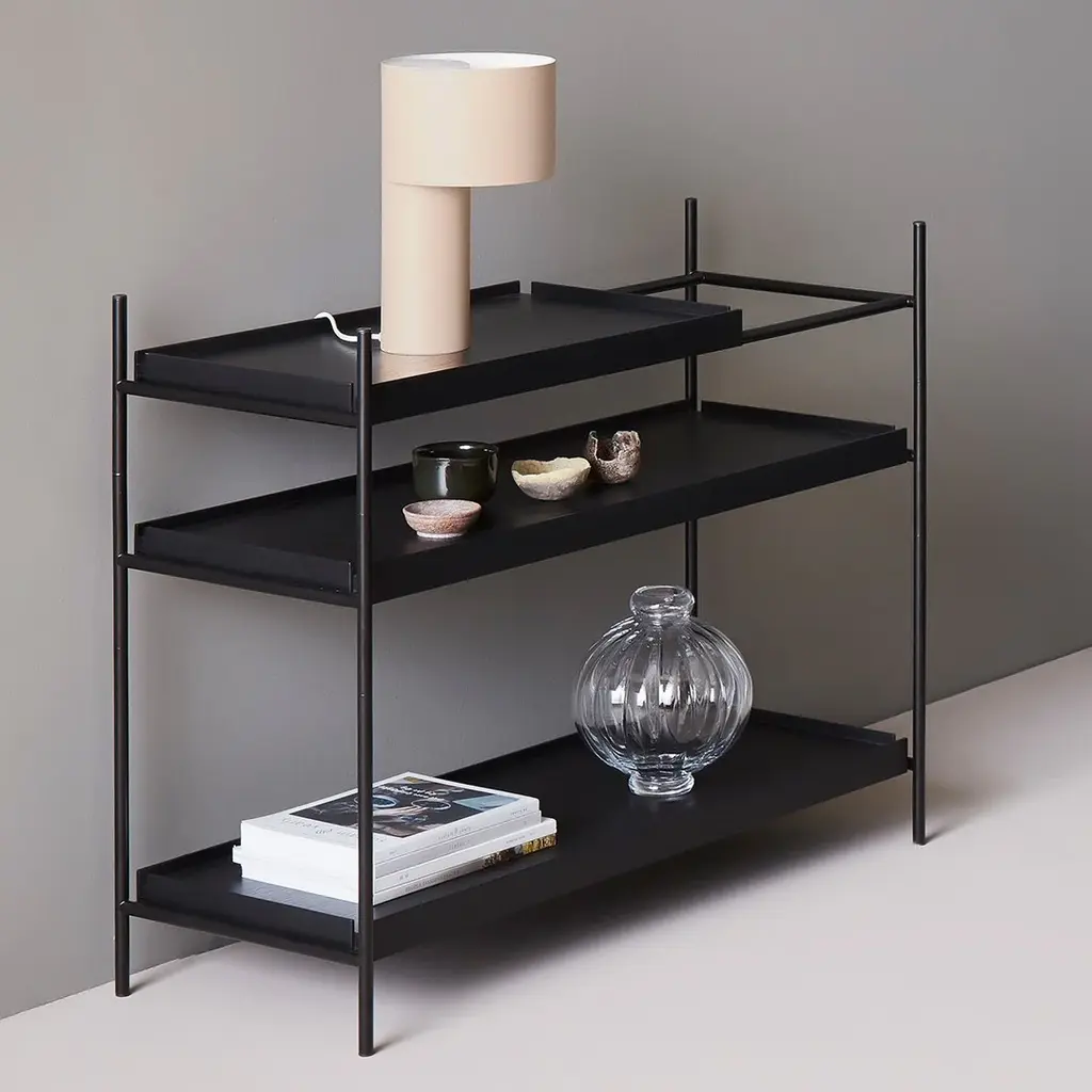 Gaps in the shelving system are created by moving the small trays, which allow taller objects to be placed in the open space. The various possible arrangements of the shelves make the shelving system vivid and personal. Take the trays and place them on the different levels in the frame until you have the arrangement you like. Tray Shelf is Japanese in its elegant expression. German in its solid and thorough construction.