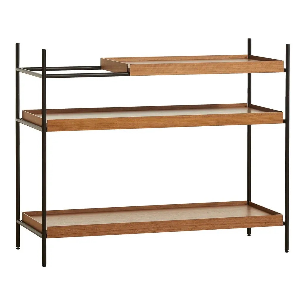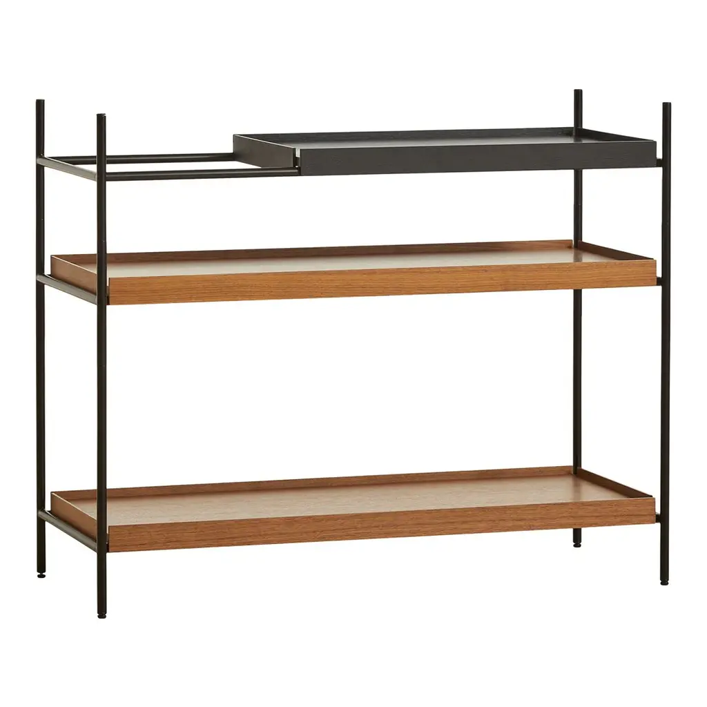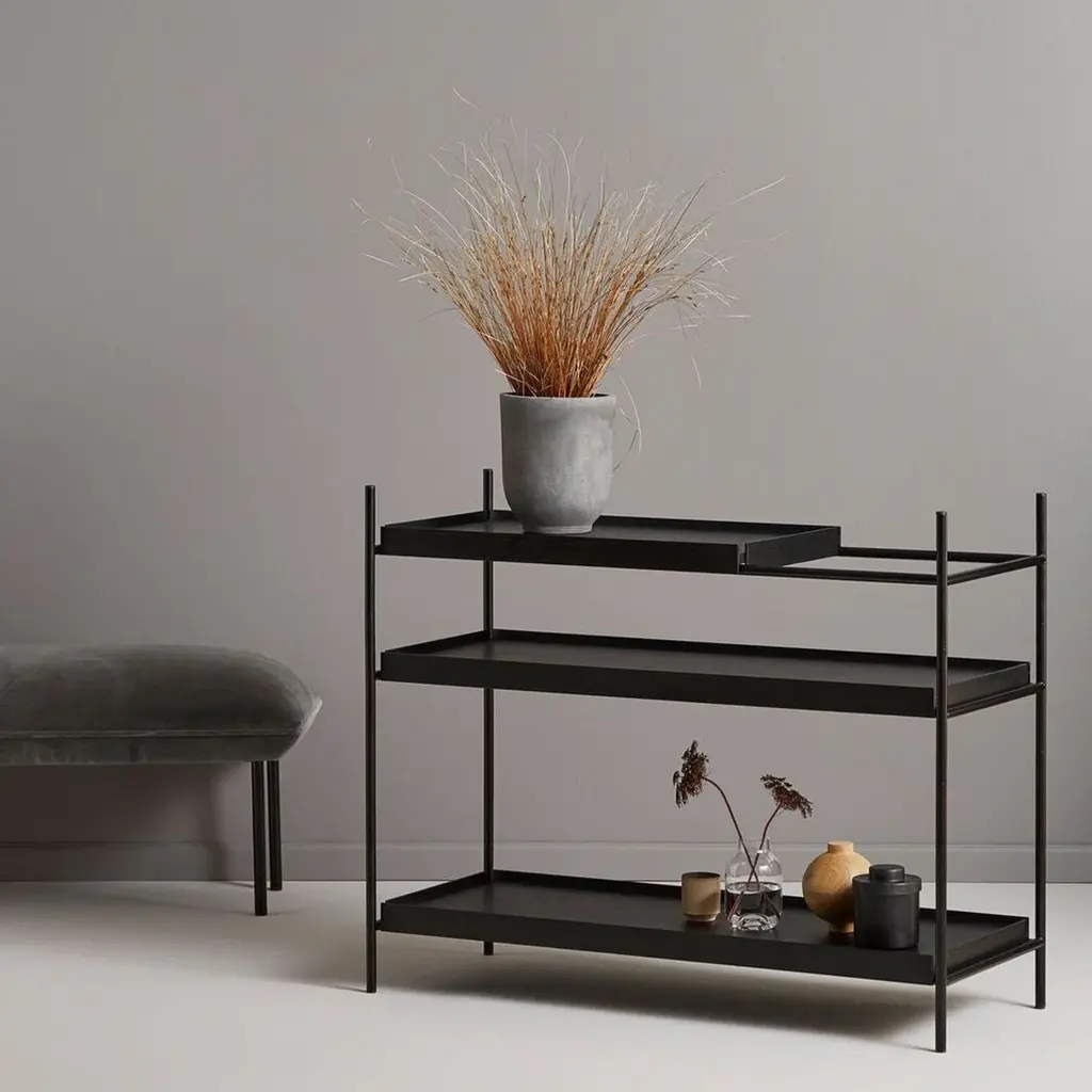 Gaps in the shelving system are created by moving the small trays, which allow taller objects to be placed in the open space. The various possible arrangements of the shelves make the shelving system vivid and personal. Take the trays and place them on the different levels in the frame until you have the arrangement you like. Tray Shelf is Japanese in its elegant expression. German in its solid and thorough construction.