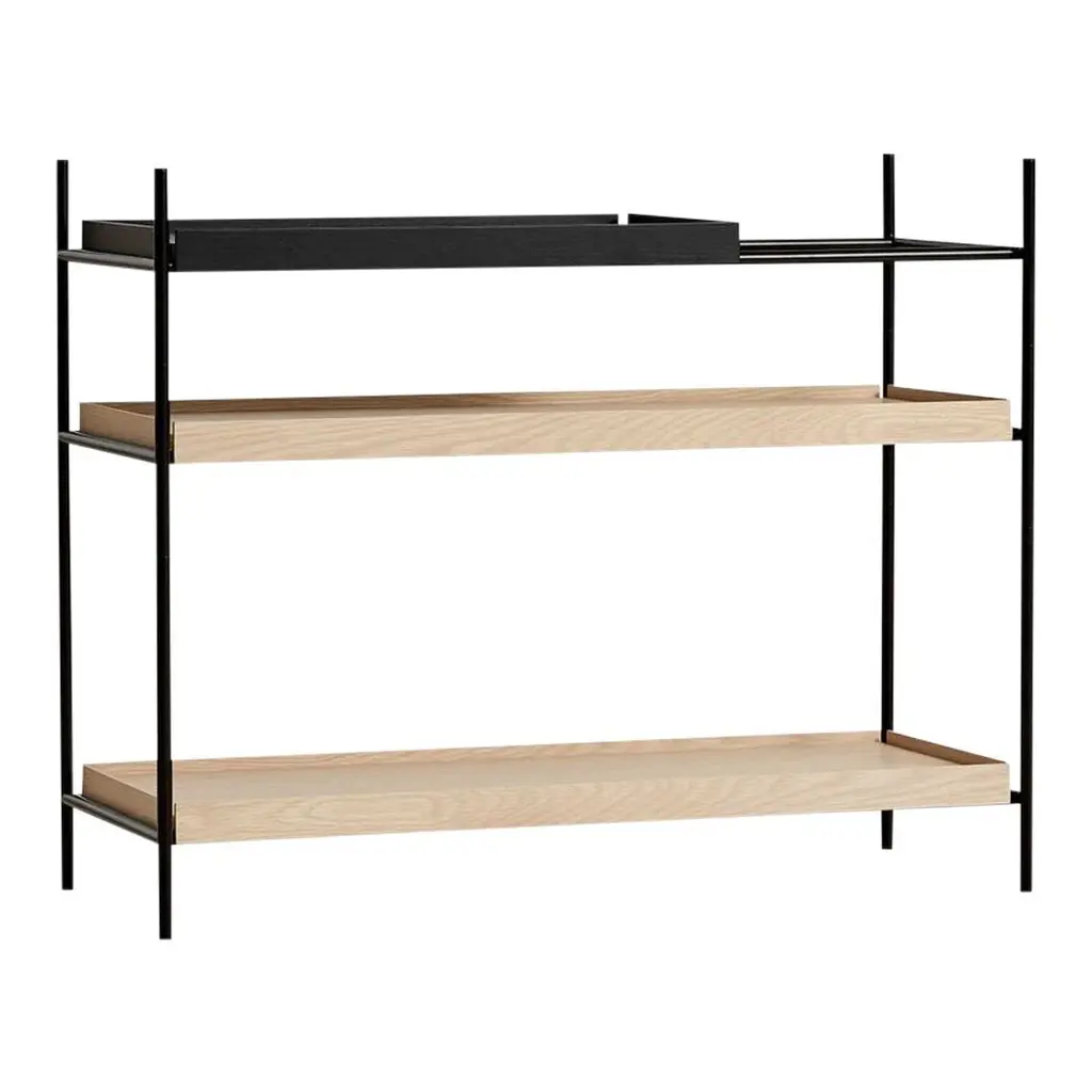 Gaps in the shelving system are created by moving the small trays, which allow taller objects to be placed in the open space. The various possible arrangements of the shelves make the shelving system vivid and personal. Take the trays and place them on the different levels in the frame until you have the arrangement you like. Tray Shelf is Japanese in its elegant expression. German in its solid and thorough construction.