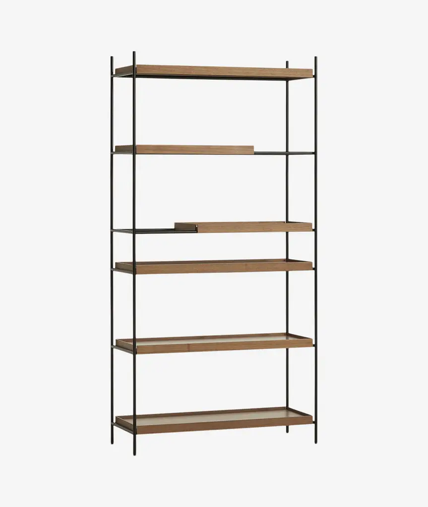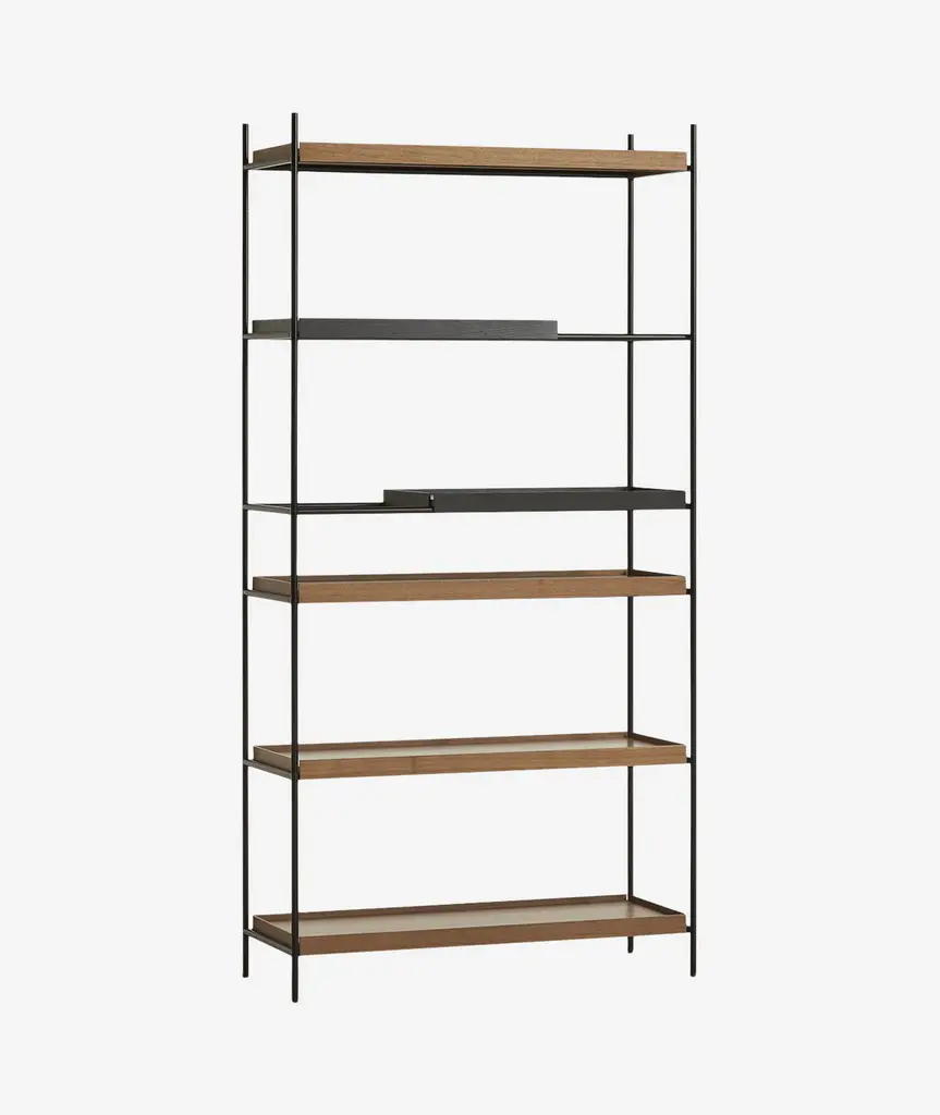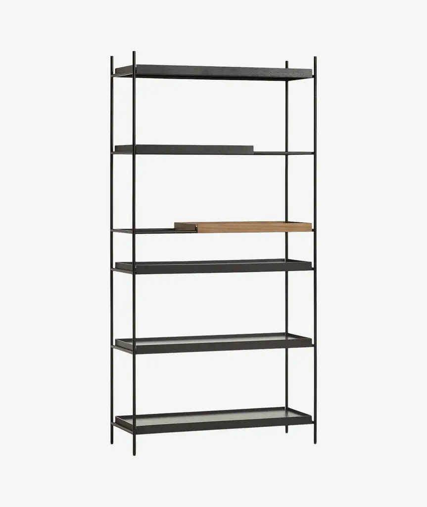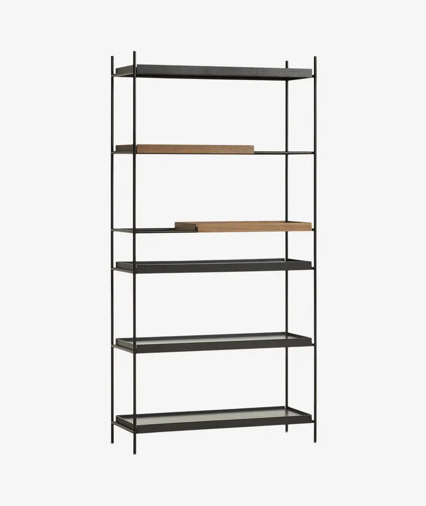 Tray Shelf is a vivid shelving system with straight lines, aesthetic symmetry and simple expression. Designed to create various possible arrangements of the tray making the shelving system dynamic and personal by choosing your favorite tray combination. Take the trays and place them on the different levels in the frame. Gaps in the shelving system are created by moving the small trays, which allow taller objects to be placed in the open space.