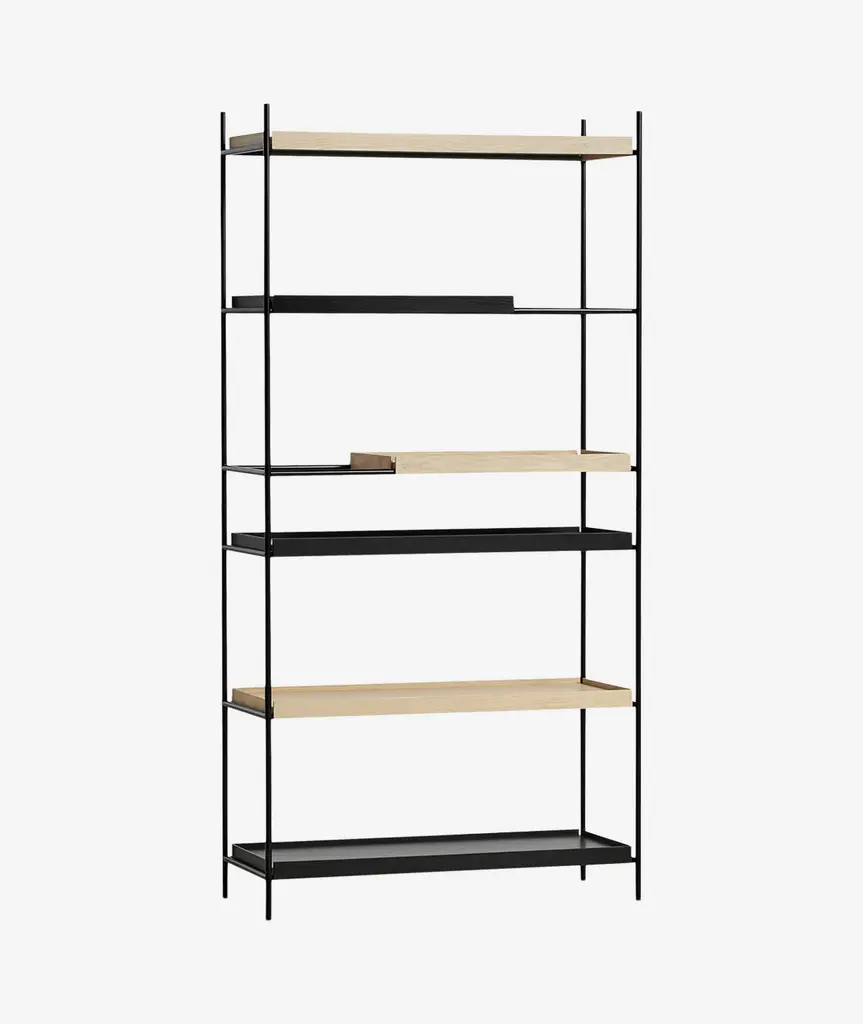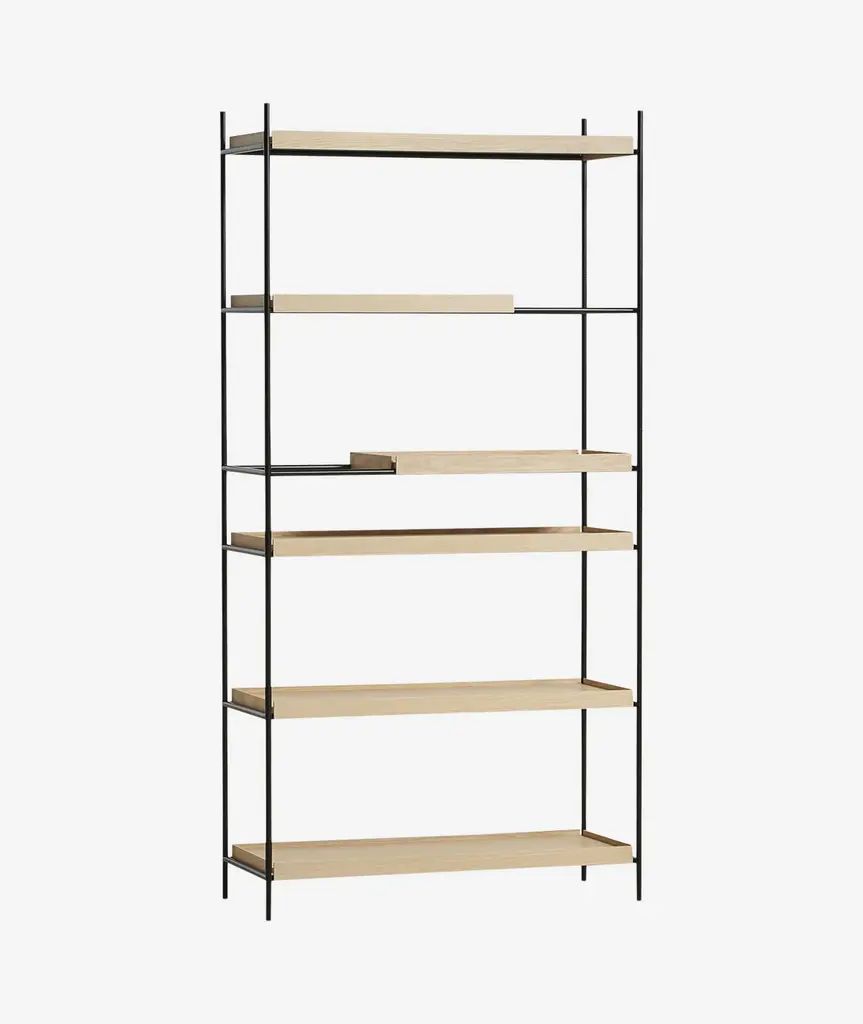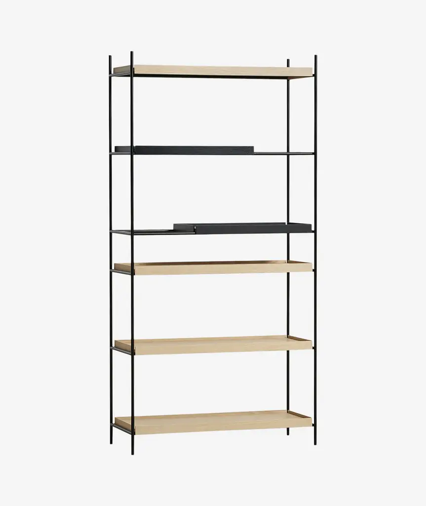 Tray Shelf is a vivid shelving system with straight lines, aesthetic symmetry and simple expression. Designed to create various possible arrangements of the tray making the shelving system dynamic and personal by choosing your favorite tray combination. Take the trays and place them on the different levels in the frame. Gaps in the shelving system are created by moving the small trays, which allow taller objects to be placed in the open space.