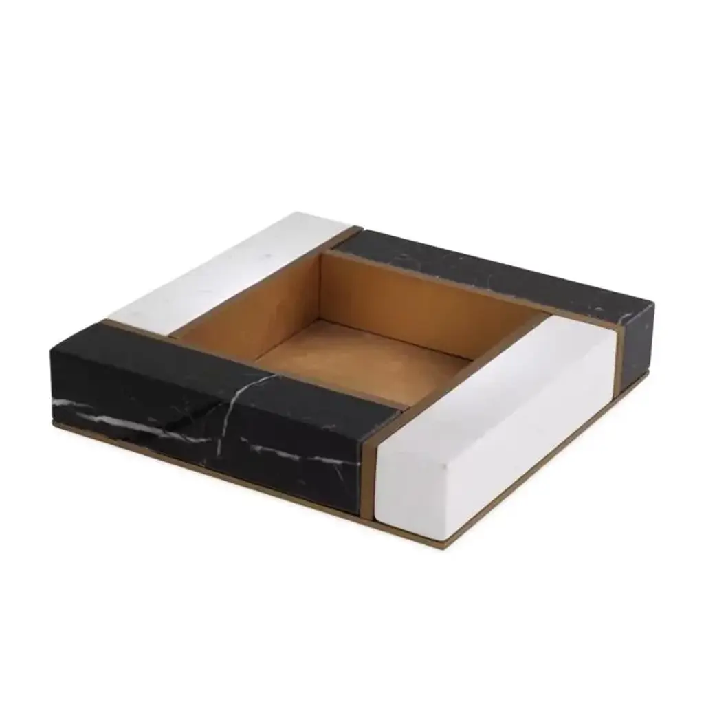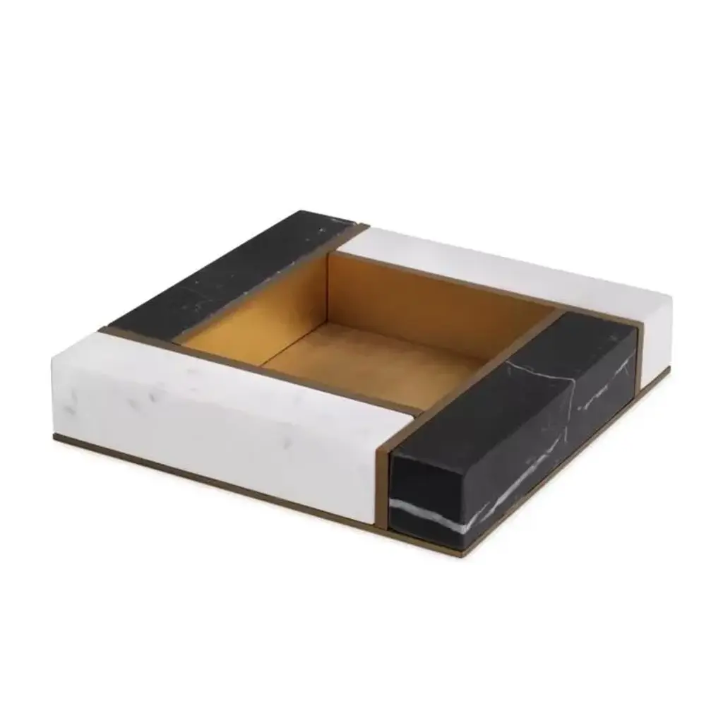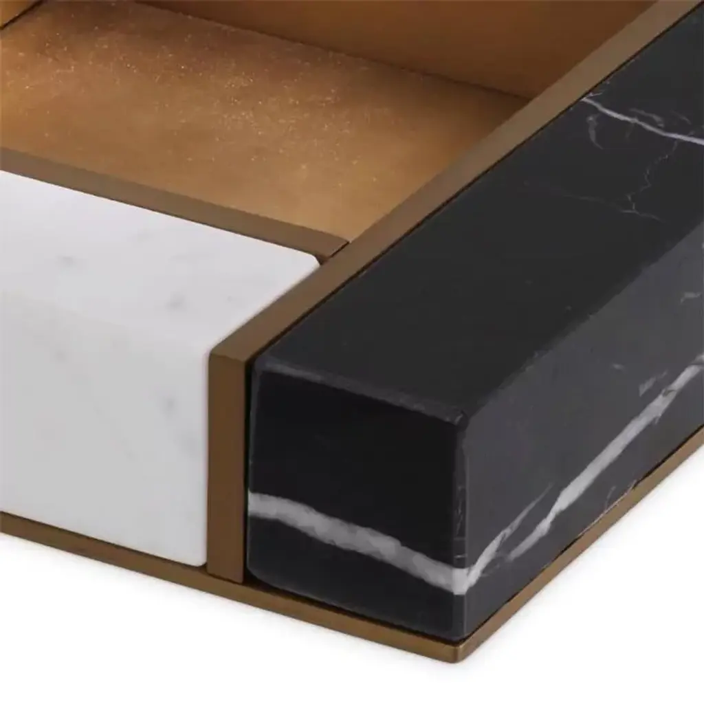 Antique brass finish surface and raised edges that are inlaid with white and black marble.