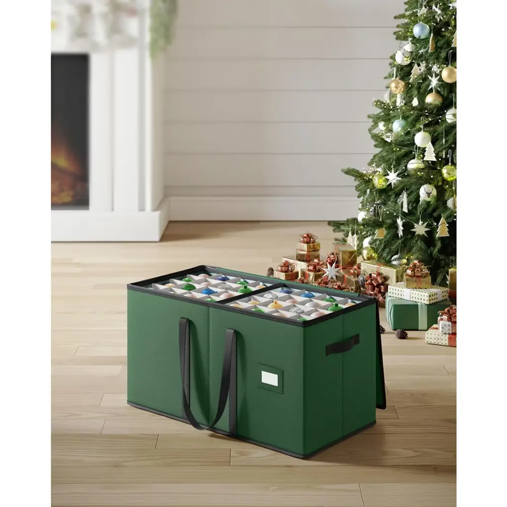 When you wrap your ornaments up in tissue paper or newspaper, your Christmas tree ornaments are not as safe as you may think. Wrapping your ornaments in paper and placing them into boxes leads to xmas ornaments breaking as we all becoming discolored from the acid in the very paper you used to try and protect those ornaments. On top of this, the wrapping process takes a long time to finish and unpack the next Christmas. The 2-tray Christmas ornament storage box is a durable storage container holding up to 48 (3 in.) ornaments. The two Christmas ornament organizer trays are lined with acid-free fabric to prevent damage and discoloration of your ornaments. In addition to carefully cradling each ornament, the trays are removable to make it easier to walk around the tree placing ornaments. Each year, you can easily view the contents of the Christmas ornament box through the large clear plastic window on the top of the bag. The durable polyester fabric will keep dust and moisture out. This Christmas ornament storage container is perfect for protecting your sentimental and precious ornaments in storage for the whole off season.