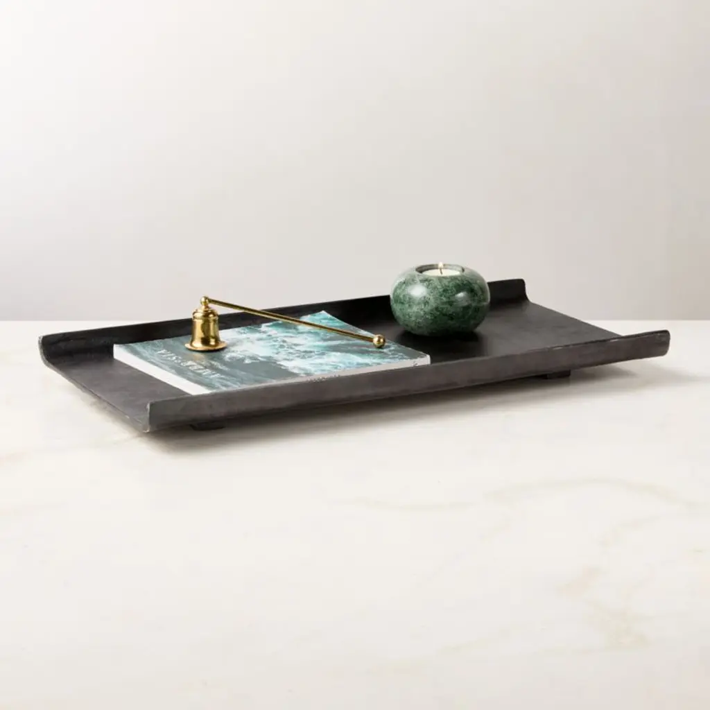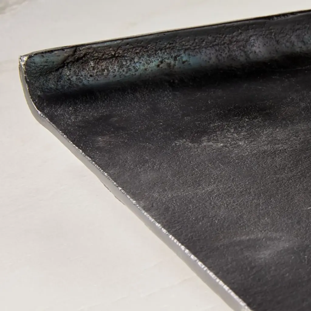 Rectangular cast metal tray adds a modern industrial look to the tablescape. Sand cast to achieve a textured surface, the piece is then metal-plated to achieve an antiqued patina. The rich blackened bronze finish will further develop a patina over time, giving the piece the one-of-a-kind look of a vintage find. CB2 exclusive.
