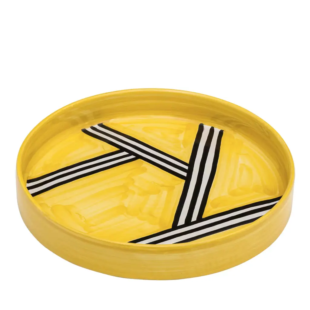This striking ceramic tray is decorated with a striking geometric pattern of parallel and perpendicular white and black lines over a dark and light grey background.