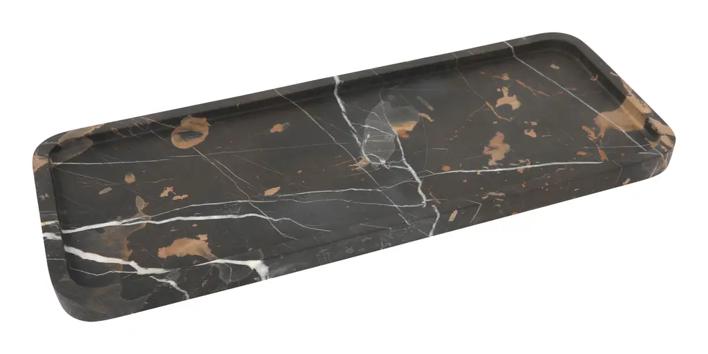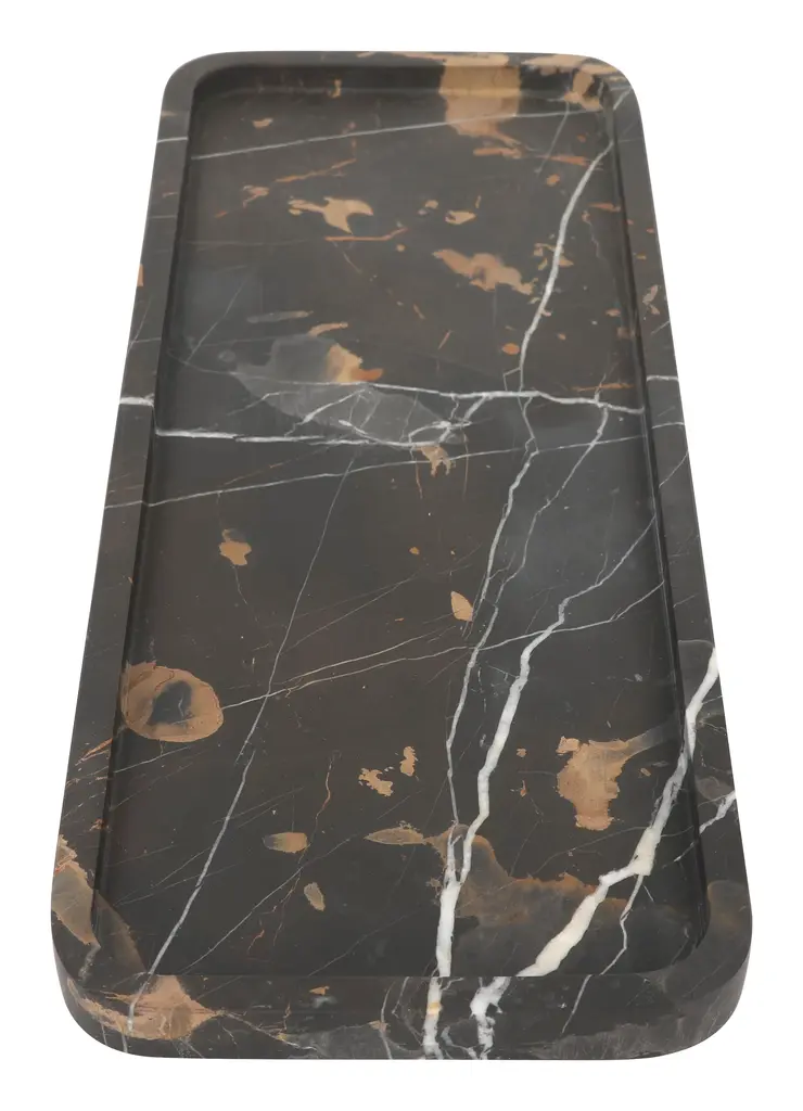 Keep everything in its place with our handsome Troy Tray. Simple yet chic, this tray is crafted from weighty black marble into a rectangular shape with rounded corners. Organic swirls of white and caramel-colored veining add to its natural beauty while also making each one completely unique. The perfect base for any tabletop vignette, we also love our monolithic Troy Tray corralling pens and pencils on the desktop, holding mail on the entryway console or as a catchall for jewelry on the dressing table. •black marble •organic white and caramel veining •each is unique Dimensions •16.5"W x 6.5"D x .75"H