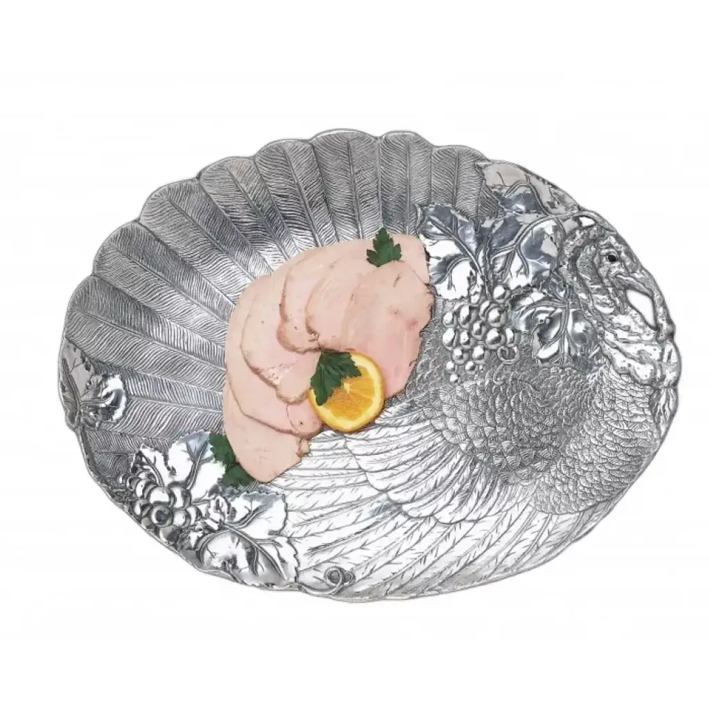 Great for serving game and entertaining a crowd, this Arthur Court Large Turkey Tray features a generous surface area, with the fabulous design and detailing Arthur Court is known for. Supply your guests with a healthy helping of meat out of this Large Turkey Tray from Arthur Court. The bird arches its head back to reveal a realistically detailed face and wattle, while beautifully defined feathers line the tail and sides of this piece. This handmade, aluminum tray holds an entire turkey and then some as the 24-inch dish leaves plenty of room for sides and garnishes.