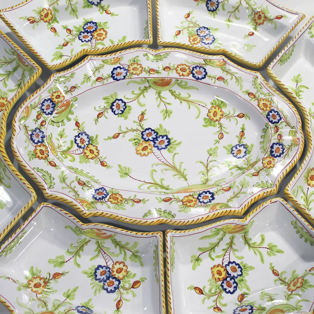 A charming accessory for stylish dining, this gorgeous hors d'oeuvres tray will embellish any mouth-watering appetizers or even a one-dish meal with several sauces or toppings. Entirely handcrafted, glazed, and painted with vibrant colors in a classic 18th-century floral pattern, this exceptional set belongs to Lorenza Adami's signature Tuscia Collection of exquisite Florentine majolica. Featuring a central, curved-edge serving dish with 6 small side platters, this remarkable objet d'art resembles those delicate petalled flowers exquisitely depicted on the ceramic.