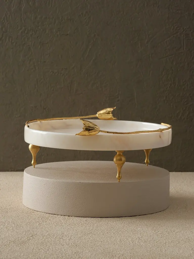 Timeless elegance blooms in the White Marble Footed Serving Tray With Twin Tulip Detail. This sophisticated piece features a round, polished marble surface elevated on graceful gold-toned feet, with an intricate twin tulip motif winding gently across its edge. The soft veining of the marble contrasts beautifully with the warm golden accents, creating a refined and artistic presentation piece.Perfect for serving pastries, fruit, or hors d’oeuvres, this tray doubles as a luxurious decorative accent. Whether adorning a dining table or adding charm to a vanity, it brings a poetic, nature-inspired elegance to any setting.