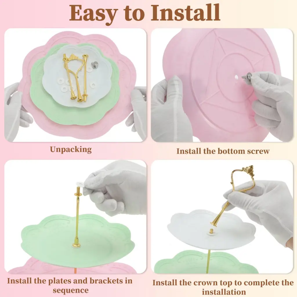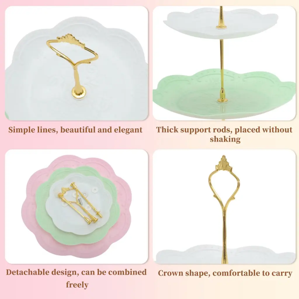 Features:This cupcake stand holder is made from quality PP material, ensuring sturdiness, and durability and having a long service time.This dessert cupcake stand makes it suitable for a wide range of occasions, including weddings, birthday parties, baby showers, and more. This cupcake stand holder is easy to assemble with no tools required, making it convenient to set up for your event. The adjustable tiers of this cupcake stand holder allow you to customize the display according to your needs. Featuring a space-saving design that allows you to save counter or table space while displaying a large number of cupcakes. Specifications:Color: White, Pink, Green, Gold ToneMaterial: PPHeight: 35cm / 13.78"Plate Size: 16cm / 6.3", 20.5cm / 8.07", 26cm / 10.24"Package List: 1 Set Cupcake Stand Holder