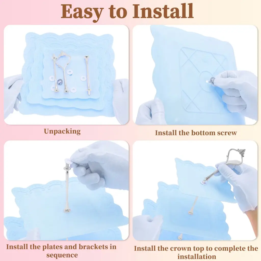 Features:This cupcake stand holder is made from quality PP material, ensuring sturdiness, and durability and having a long service time.This dessert cupcake stand makes it suitable for a wide range of occasions, including weddings, birthday parties, baby showers, and more. This cupcake stand holder is easy to assemble with no tools required, making it convenient to set up for your event. The adjustable tiers of this cupcake stand holder allow you to customize the display according to your needs. Featuring a space-saving design that allows you to save counter or table space while displaying a large number of cupcakes. Specifications:Color: Blue, Silver ToneMaterial: PPHeight: 35cm / 13.78"Plate Size: 14.5cm / 5.71", 19.5cm / 7.68", 24cm / 9.45"Package List: 1 Set Cupcake Stand Holder