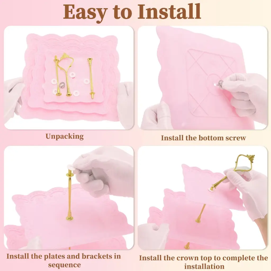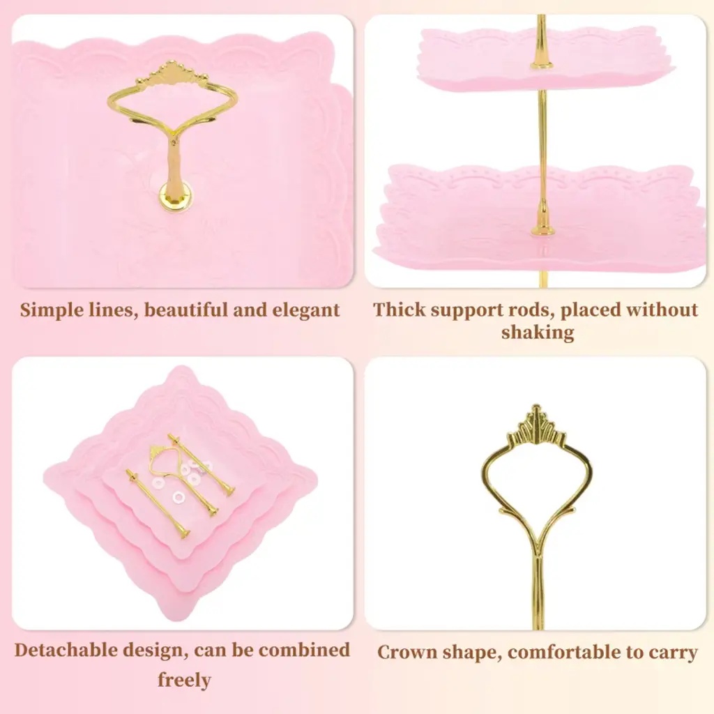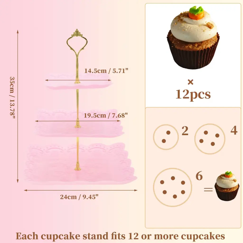 Features:This cupcake stand holder is made from quality PP material, ensuring sturdiness, and durability and having a long service time.This dessert cupcake stand makes it suitable for a wide range of occasions, including weddings, birthday parties, baby showers, and more. This cupcake stand holder is easy to assemble with no tools required, making it convenient to set up for your event. The adjustable tiers of this cupcake stand holder allow you to customize the display according to your needs. Featuring a space-saving design that allows you to save counter or table space while displaying a large number of cupcakes. Specifications:Color: Pink, Gold ToneMaterial: PPHeight: 35cm / 13.78"Plate Size: 14.5cm / 5.71", 19.5cm / 7.68", 24cm / 9.45"Package List: 1 Set Cupcake Stand Holder