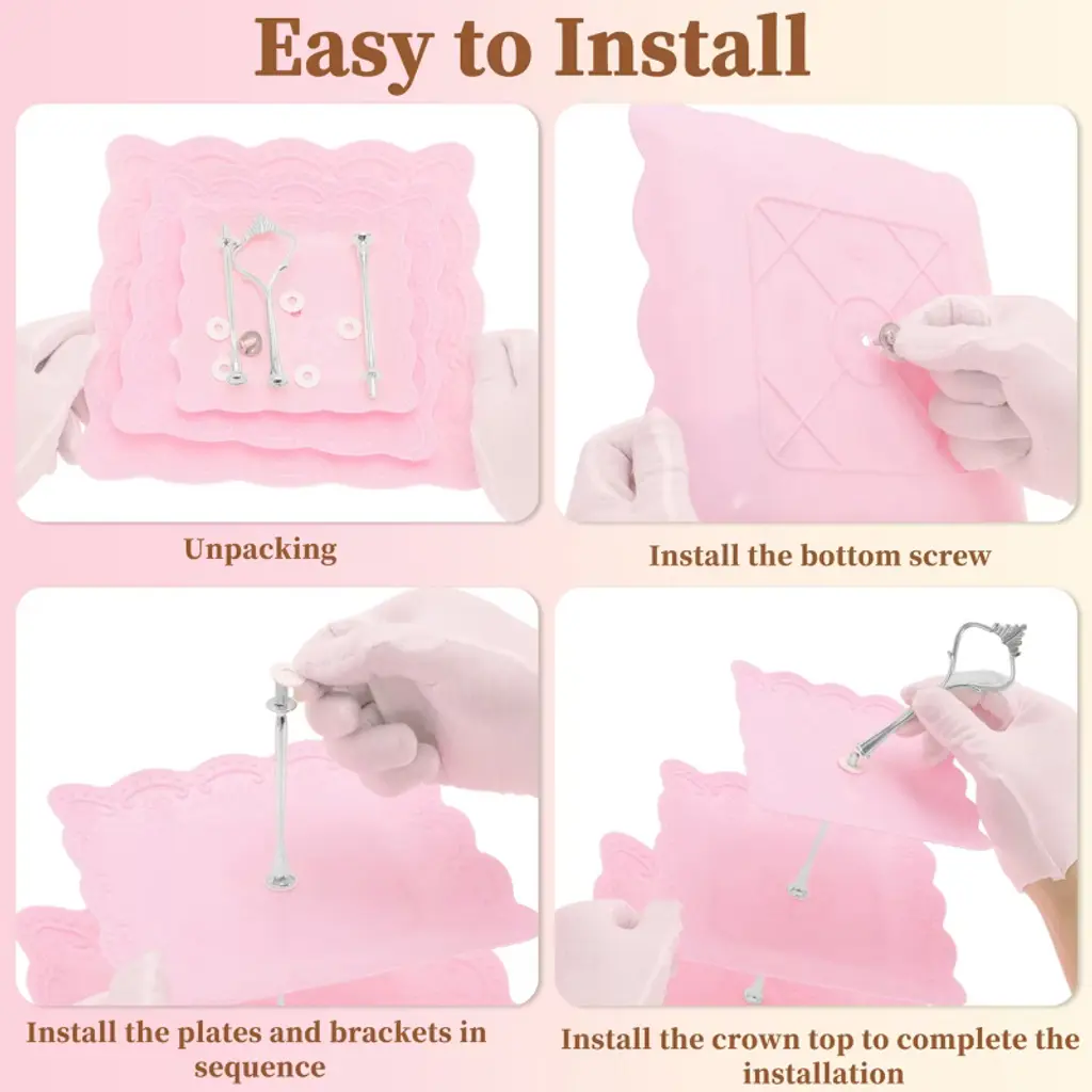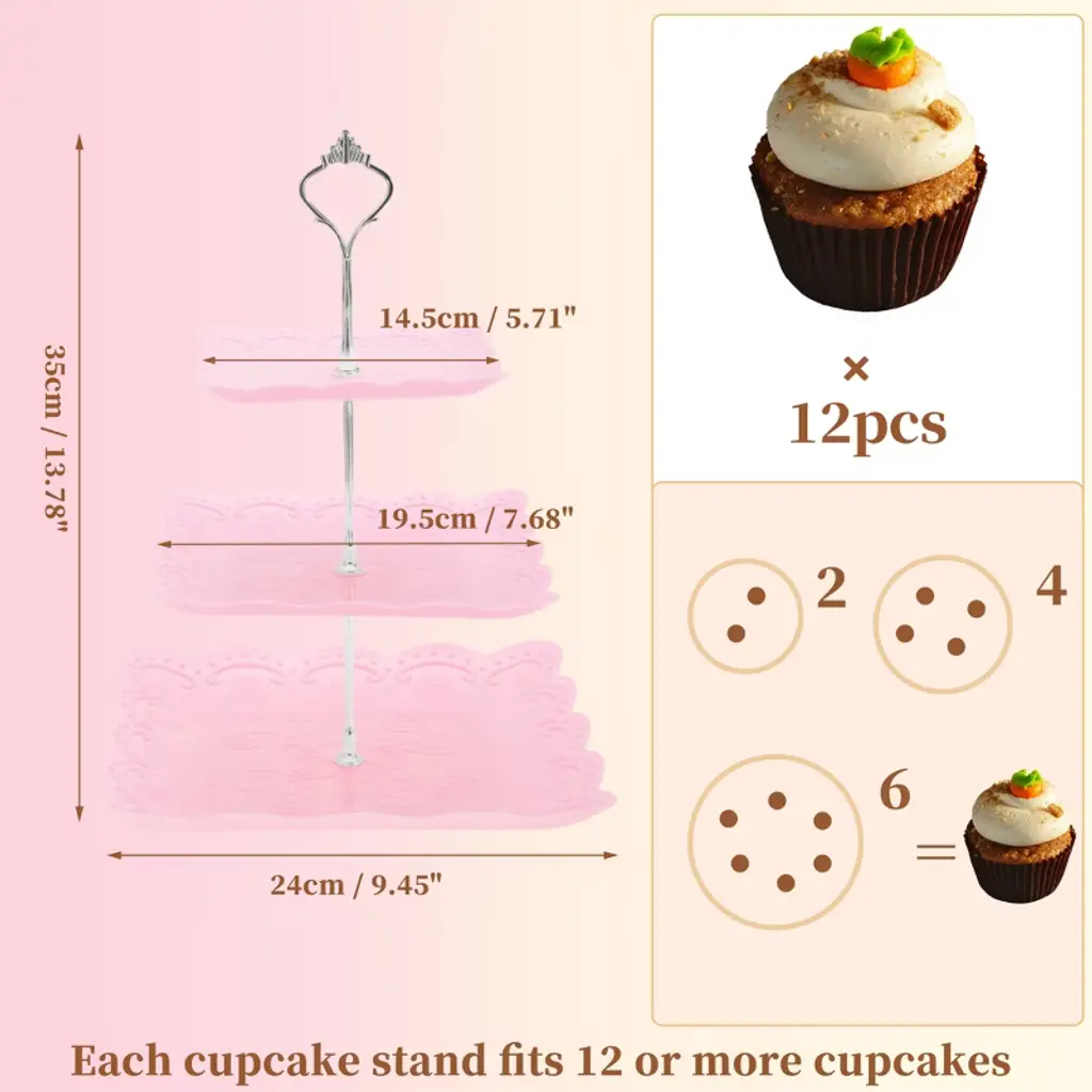 Features:This cupcake stand holder is made from quality PP material, ensuring sturdiness, and durability and having a long service time.This dessert cupcake stand makes it suitable for a wide range of occasions, including weddings, birthday parties, baby showers, and more. This cupcake stand holder is easy to assemble with no tools required, making it convenient to set up for your event. The adjustable tiers of this cupcake stand holder allow you to customize the display according to your needs. Featuring a space-saving design that allows you to save counter or table space while displaying a large number of cupcakes. Specifications:Color: Pink, Silver ToneMaterial: PPHeight: 35cm / 13.78"Plate Size: 14.5cm / 5.71", 19.5cm / 7.68", 24cm / 9.45"Package List: 1 Set Cupcake Stand Holder