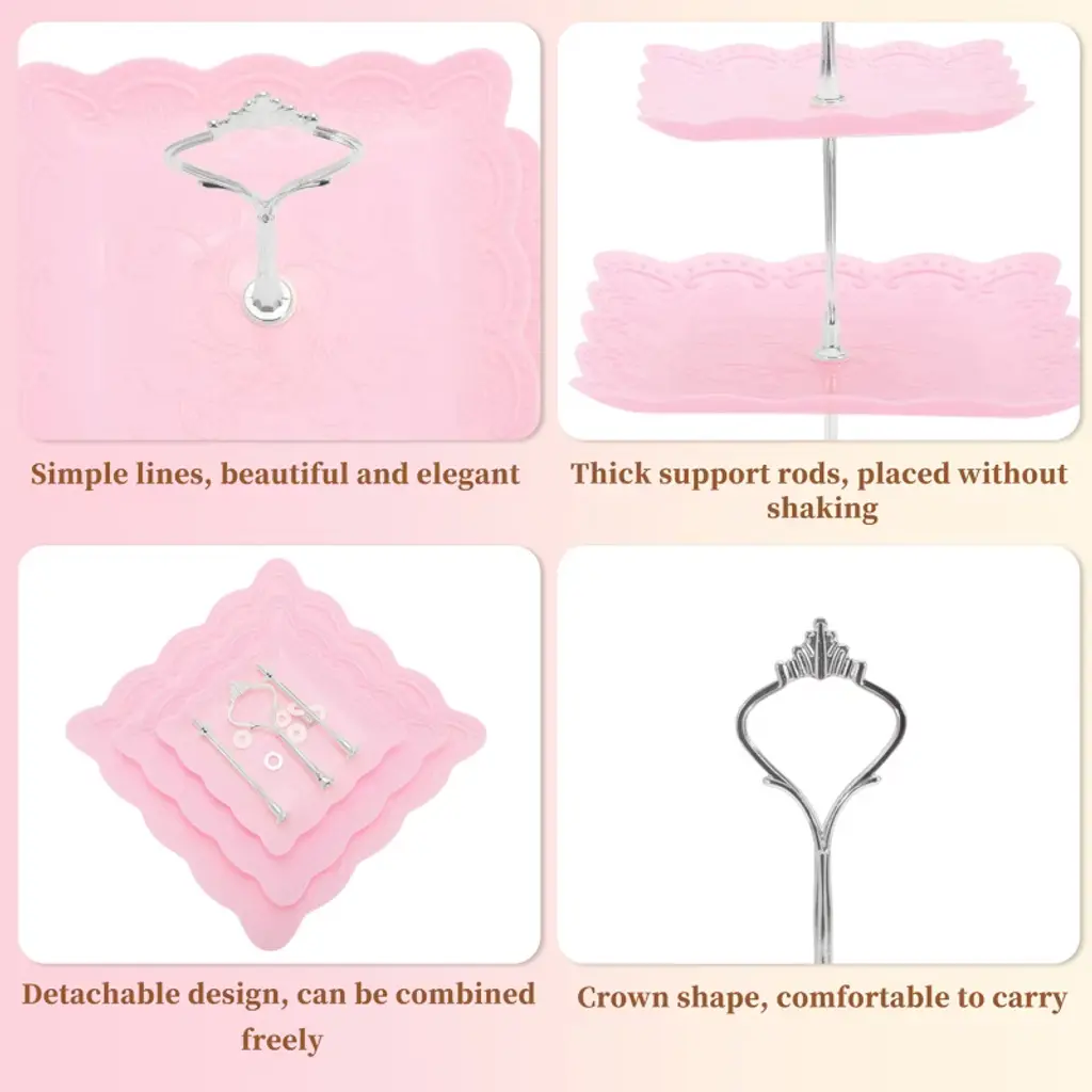 Unique Bargains 3 Tier Dessert Cupcake Stand Square With Tiered Serving Tray For Donuts Fruits Pink Silver Tone