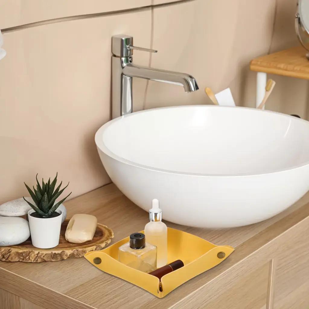 Button design makes the leather tray with bright snaps easy to assemble and won't open. You can fold it to pack it inside your case or bag when you do not need it. Portable and compact, place your items in the trays to keep them safe and secure. The trays can be stacked on top of each other for easy storage when not in use. These trays can be easily moved between many locations, such as from a nightstand to an entryway table. Wide application for various settings, including entry tables, bedside stands, entrance cabinets, countertops, and dressers. Great for organizing personal belongings and reducing clutter, including keys, watches, jewelry, earbuds, cell phones, coins, makeup, pens, and glasses. This catchall storage tray serves as a good decoration for rooms and makes a wonderful gift for graduations, anniversaries, birthdays, Thanksgiving, Christmas, White Elephant, and Valentine’s Day.