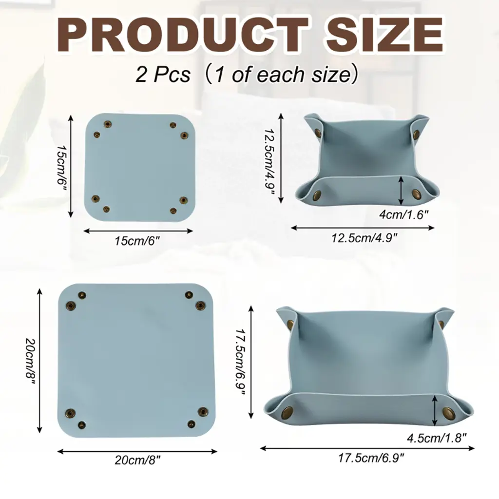Button design makes the leather tray with bright snaps easy to assemble and won't open. You can fold it to pack it inside your case or bag when you do not need it. Portable and compact, place your items in the trays to keep them safe and secure. The trays can be stacked on top of each other for easy storage when not in use. These trays can be easily moved between many locations, such as from a nightstand to an entryway table. Wide application for various settings, including entry tables, bedside stands, entrance cabinets, countertops, and dressers. Great for organizing personal belongings and reducing clutter, including keys, watches, jewelry, earbuds, cell phones, coins, makeup, pens, and glasses. This catchall storage tray serves as a good decoration for rooms and makes a wonderful gift for graduations, anniversaries, birthdays, Thanksgiving, Christmas, White Elephant, and Valentine’s Day.