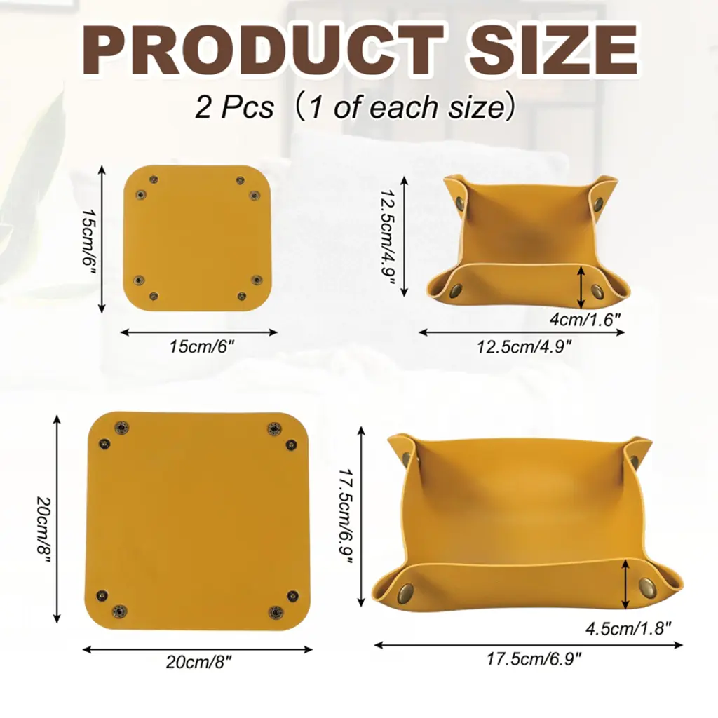 Button design makes the leather tray with bright snaps easy to assemble and won't open. You can fold it to pack it inside your case or bag when you do not need it. Portable and compact, place your items in the trays to keep them safe and secure. The trays can be stacked on top of each other for easy storage when not in use. These trays can be easily moved between many locations, such as from a nightstand to an entryway table. Wide application for various settings, including entry tables, bedside stands, entrance cabinets, countertops, and dressers. Great for organizing personal belongings and reducing clutter, including keys, watches, jewelry, earbuds, cell phones, coins, makeup, pens, and glasses. This catchall storage tray serves as a good decoration for rooms and makes a wonderful gift for graduations, anniversaries, birthdays, Thanksgiving, Christmas, White Elephant, and Valentine’s Day.