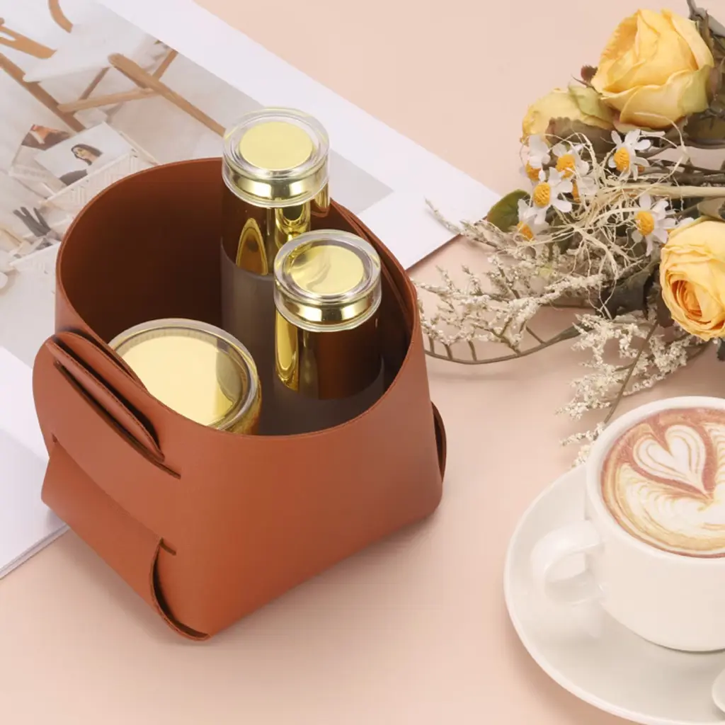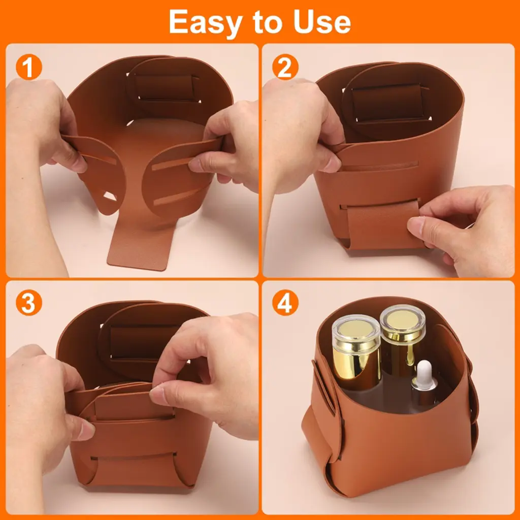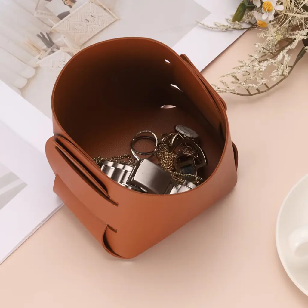 The valet tray is made of PU leather for durability and the look of real leather. The interior is lined with faux leather to protect the stored items from scratches and damage. It is easy to assemble and remove, making it a collapsible storage basket. You only need to pass the two ropes through the holes and tie them together to fix them. When not in use, it can be folded to pack inside your case or bag. This storage tray helps manage various small items, such as cosmetics, makeup brushes, health and beauty supplies, jewelry, cell phones, change, keys, watches, and pens. It is suitable for daily items on dressing tables, countertops, and drawers. These trays are great for home and office use, organizing personal belongings, and reducing clutter, including on entry tables, bedside stands, and dressers. It also makes a good gift idea for housewarming and makeup artists.