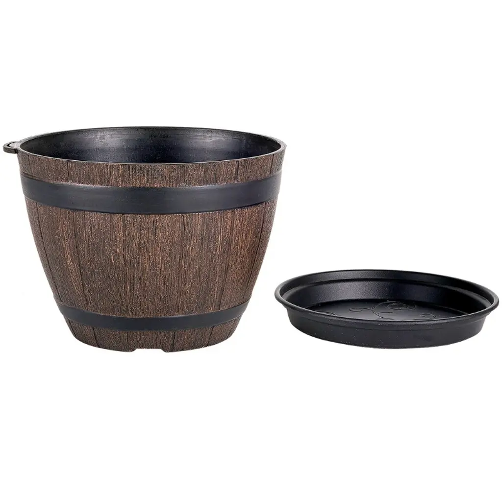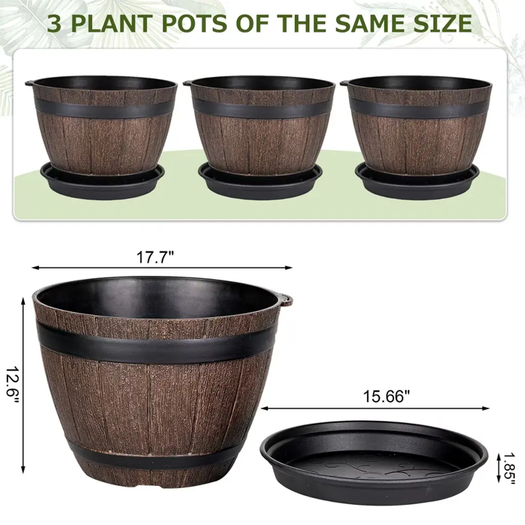 With its simple texture and wine barrel-inspired design, this plant planter set is not only distinctive, but also adds a touch of sophistication to both indoor and outdoor spaces. Each home pot plant planter comes with a tray that collects excess water, prevents spills, keeps the surrounding area dry and clean, and also makes it easy to determine your plant's watering needs. Made of durable polyethylene material, the indoor planters are lightweight, easy to move and long-lasting, providing an ideal growing environment for plants in the home and garden. Drainage holes in the bottom allow excess water to run off, preventing water from pooling at the roots and promoting healthy plant growth. This planter with drainage holes and bottom tray is suitable for most plants and also makes a perfect gift for gardening enthusiasts.